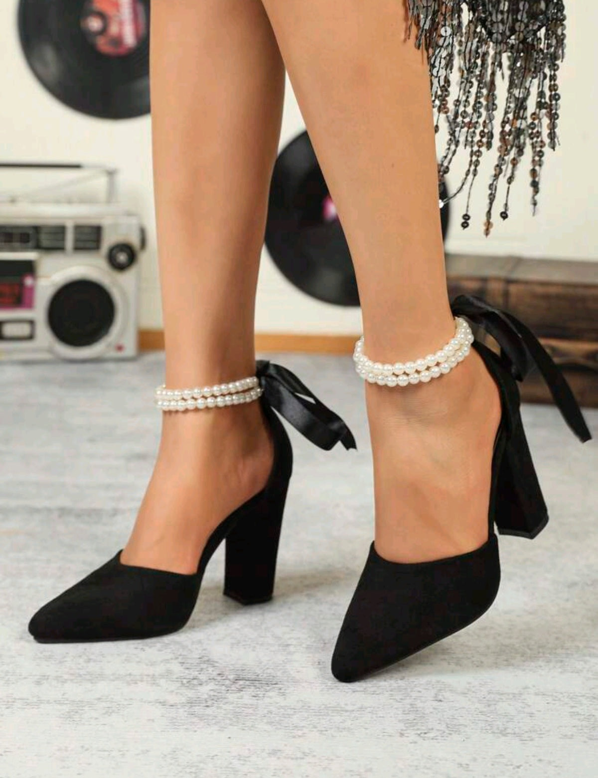 Címke nélküli, fekete, zárt orrú és sarokkal ellátott cipő, vastag magas sarokkal és gyöngyös bokapánttal, amelyet hátul szatén masni díszít. Klasszikus és nőies darab, amely különleges megjelenést biztosít alkalmi eseményeken, bulikon vagy elegáns vacsorákon.