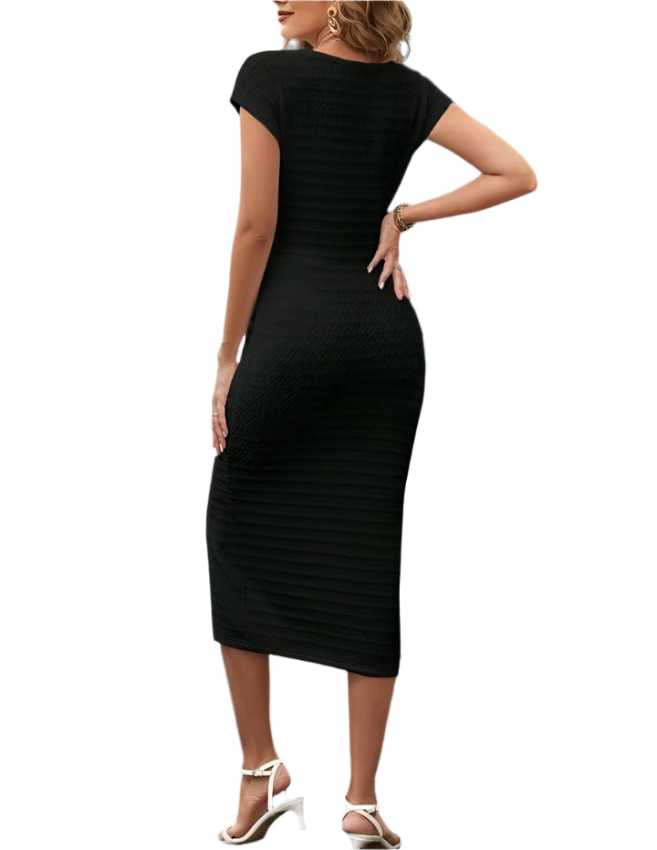Címke nélküli, fekete elegáns midi ruha. Rövid ujjú, kerek nyakkivágású fazon, amely kiemeli a nőies vonalakat. Az oldalán csavart részlet és oldalsó felsliccelés teszi különlegessé. Rugalmas anyaga kényelmes viseletet biztosít. Tökéletes választás alkalmi eseményekre, munkahelyi öltözéknek vagy esti programokhoz.