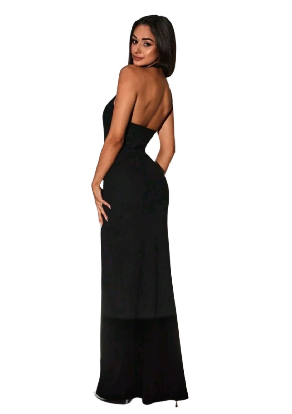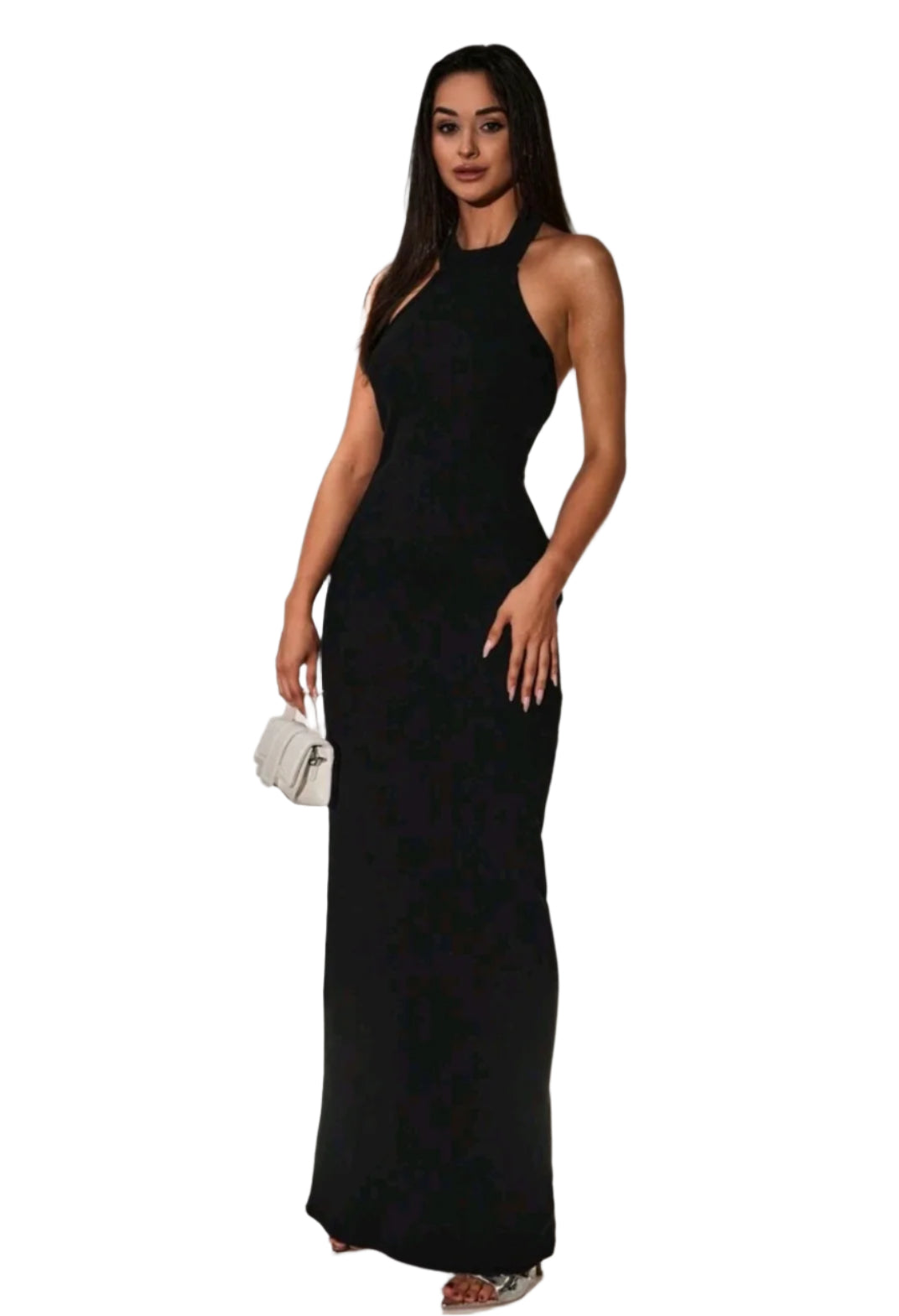 Címke nélküli, testhezálló és elegáns maxi ruha magasított nyakkal és nyakbakötős megoldással. Letisztult, minimalista dizájnjának köszönhetően tökéletes választás estélyekre, formális eseményekre vagy elegáns vacsorákra. Puha és rugalmas anyaga kényelmes viseletet biztosít.