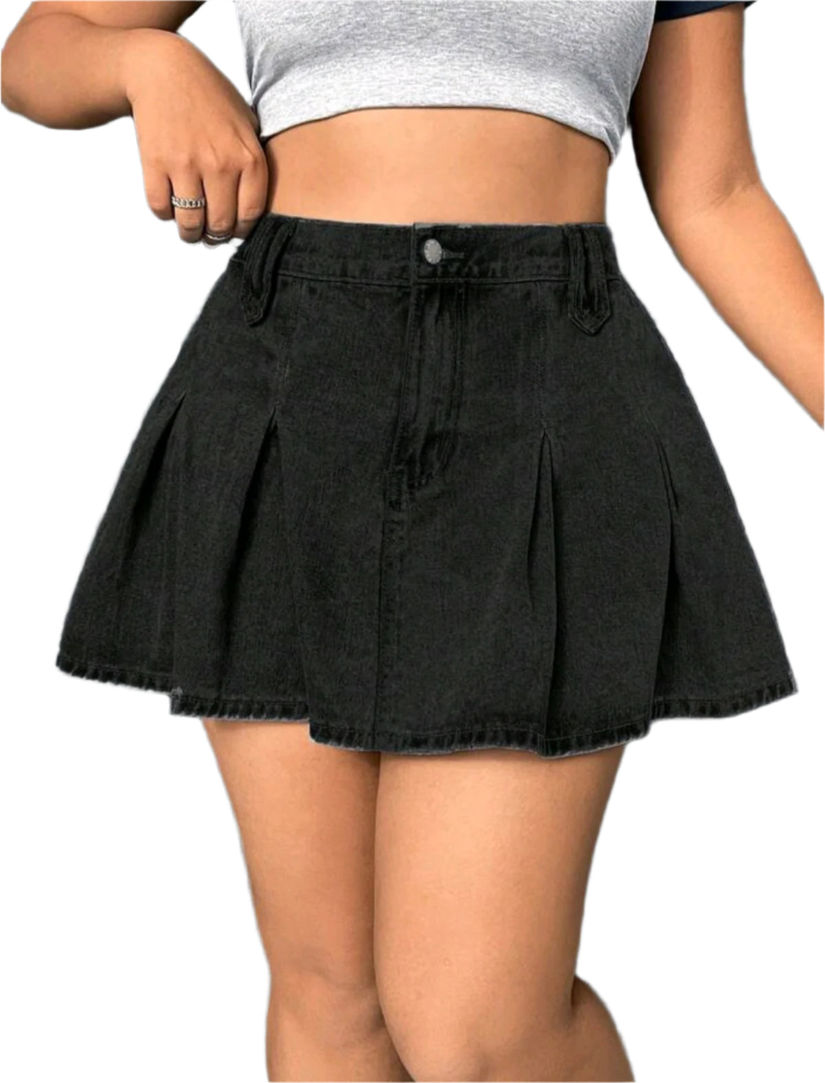 Címke nélküli, fekete színű, farmer hatású rakott szoknya. Magas derekú kialakítás, klasszikus cipzáras és gombos záródással. Rövid, A-vonalú szabásának köszönhetően csinos és divatos viselet hétköznapi vagy trendi outfitekhez.