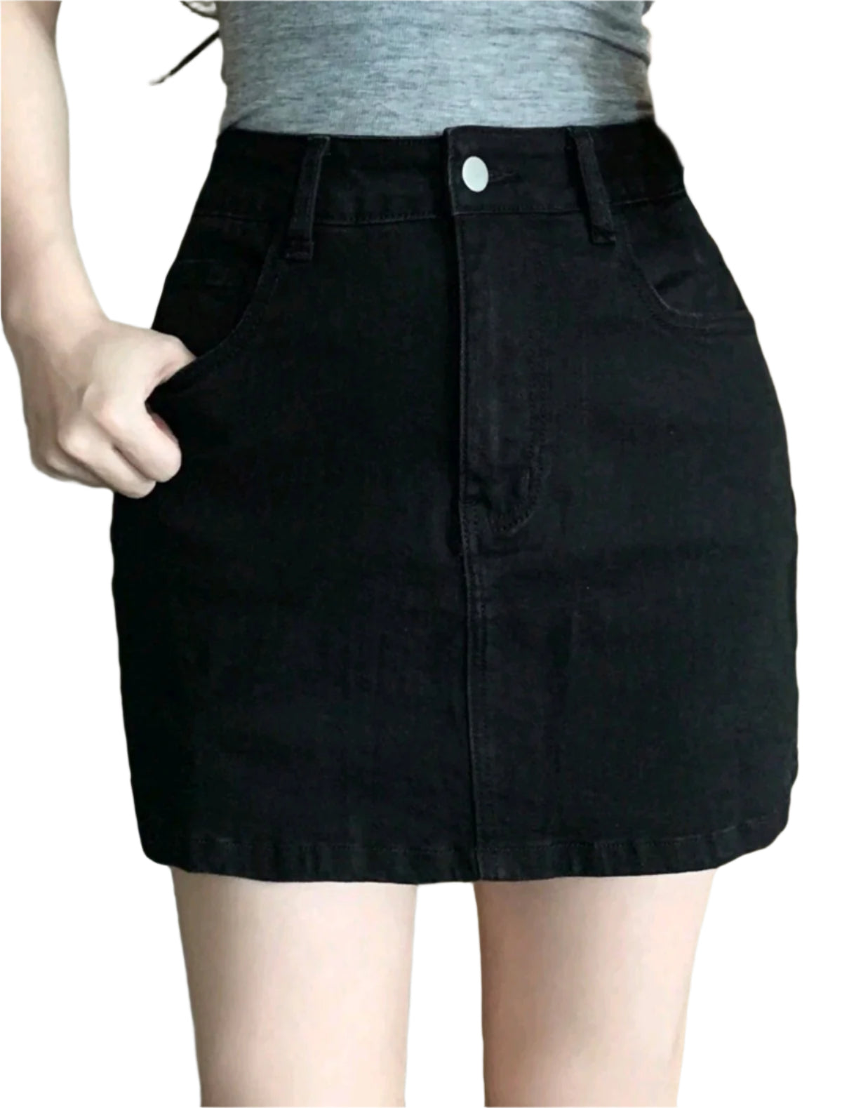Címke nélküli, klasszikus fekete farmer miniszoknya magas derékkal és gombos cipzáras rögzítéssel. Kényelmes és trendi darab, amely tökéletes választás mindennapi viseletre vagy laza, divatos outfitekhez. Oldalzsebekkel és övbújtatókkal ellátva, hogy könnyedén variálhasd stílusod.