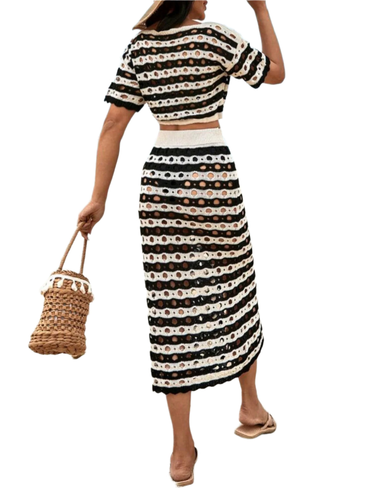 Címke nélküli, fekete-fehér csíkos horgolt maxi szoknya, amely egyedi áttört mintázatával könnyed és légies viseletet biztosít. Magas derekú fazonja kiemeli az alakot, míg a derékrészen található megkötő extra kényelmet nyújt. Tökéletes választás nyári napokra, tengerparti sétákhoz vagy bohém stílusú outfitekhez.