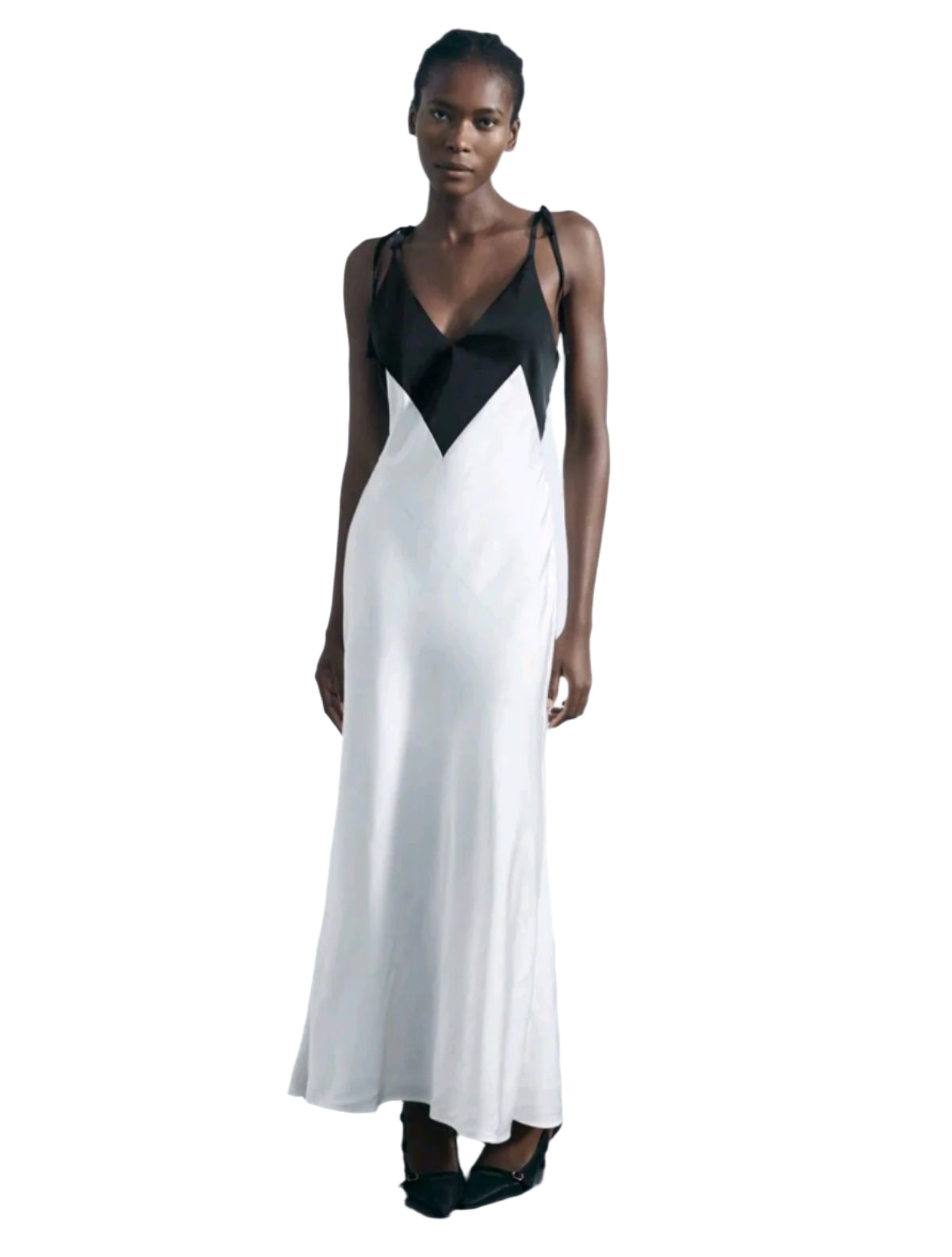 Címke nélküli, elegáns maxi ruha fekete-fehér színblokkal, V-kivágással és vékony, megköthető vállpántokkal. Légies esésű, nőies szabású darab, amely alkalmas estélyekre, elegáns eseményekre vagy különleges alkalmakra. Kényelmes és kifinomult viselet.