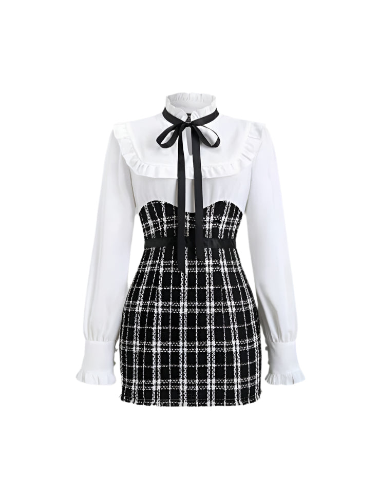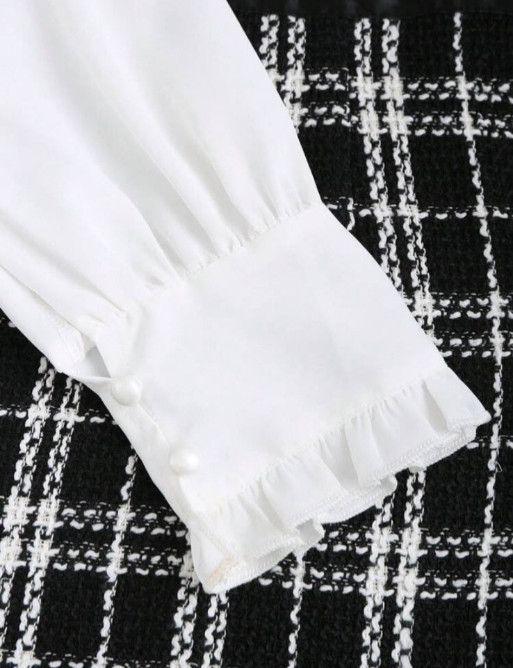 Címke nélküli, különleges fekete-fehér ruha fodros gallérral és masnis díszítéssel. Az elegáns kontrasztos design és a tweed hatású szoknyarész egyedi megjelenést biztosít. Ideális választás alkalmi eseményekre vagy különleges napokra.