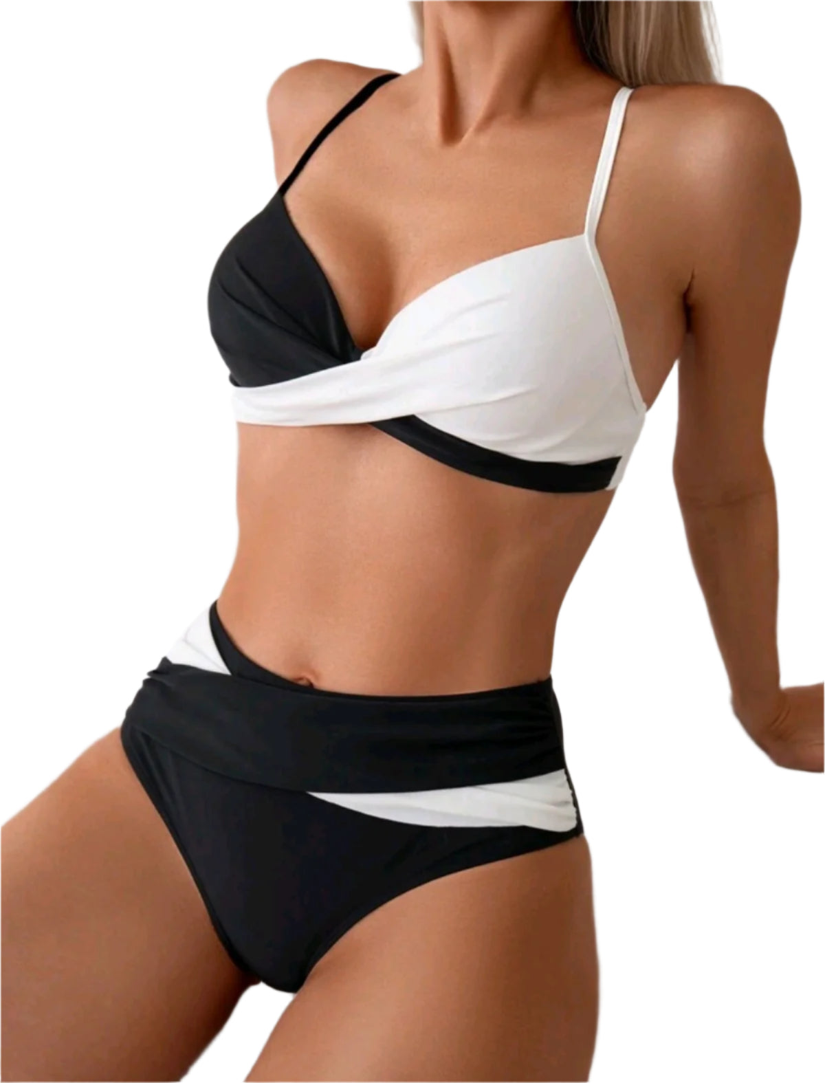 Címke nélküli, fekete-fehér, sima anyag, kétrészes fazon, V-nyakkivágás keresztpántos felsővel, vékony vállpántok, magas derekú alsó keresztbetéttel.