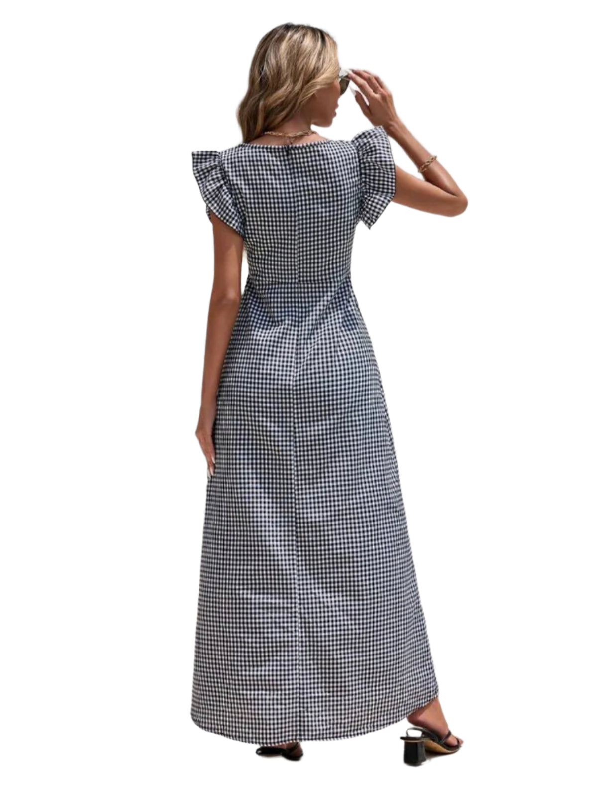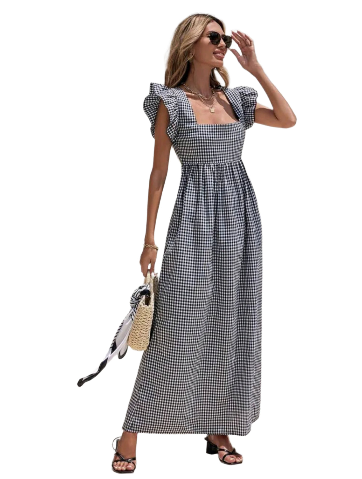Címke nélküli, fekete-fehér kockás maxi ruha könnyed, nyárias fazonban. Négyzetes nyakkivágása és fodros vállrésze romantikus megjelenést kölcsönöz, míg az empire szabásvonal kényelmes viseletet biztosít. Lezser, bő szoknyarésze légies hatást ad, így ideális választás nyaralásokhoz, hétköznapi viselethez vagy bohém stílusú eseményekre.