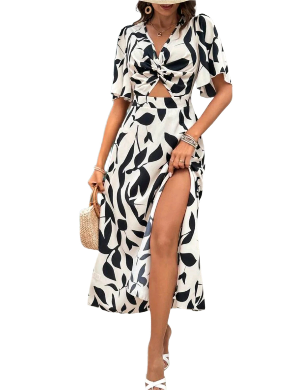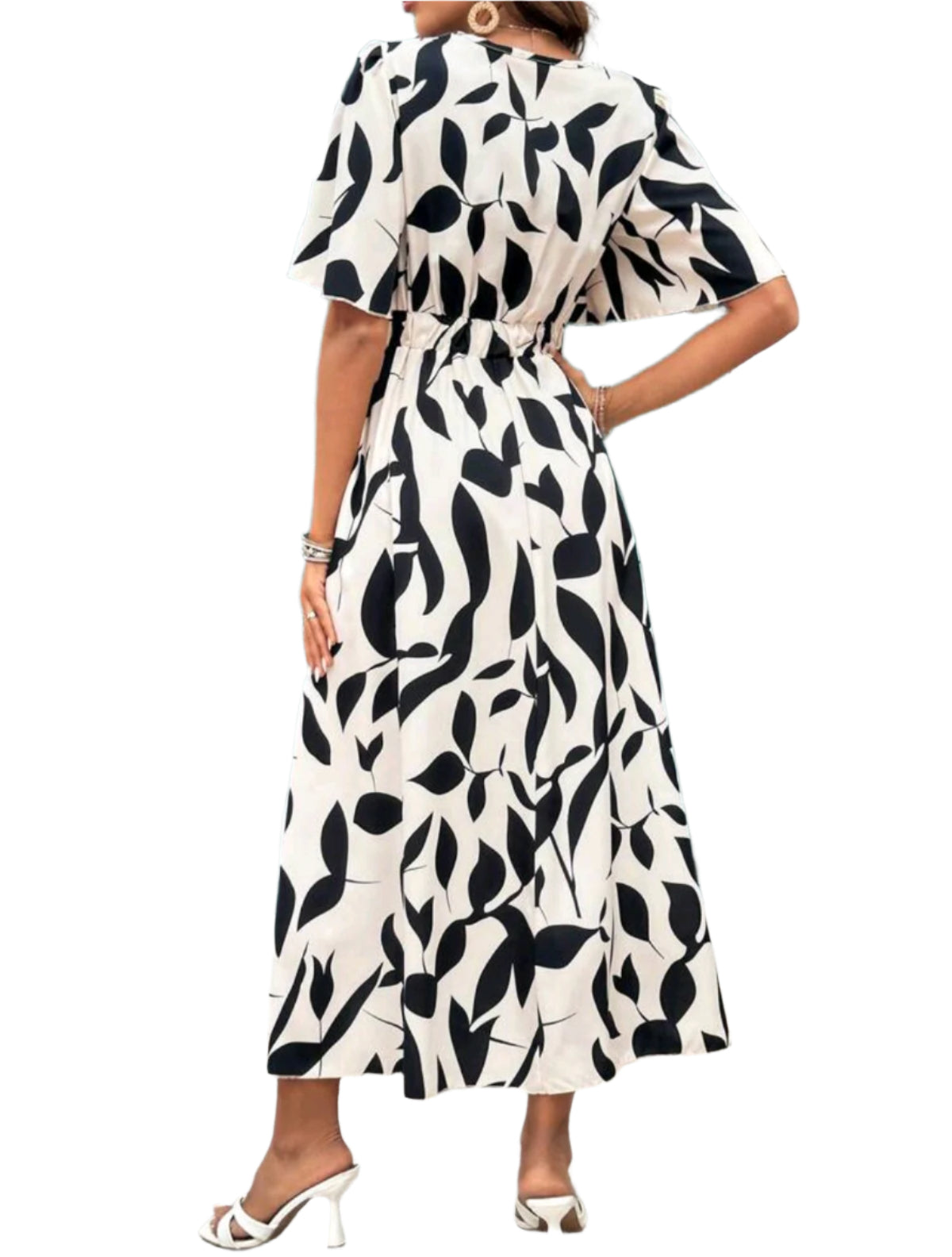 Címke nélküli, könnyed esésű, fekete-fehér levélmintás nyári ruha. Elöl csavart kialakítású felsőrész hasítékkal, rövid, bő ujjakkal és mély V-nyakkivágással. A derékrész kivágása trendi megjelenést biztosít, míg a combnál felvágott szoknyarész nőies és kényelmes viseletet kínál. Tökéletes nyaraláshoz, városi sétákhoz vagy nyári eseményekre.