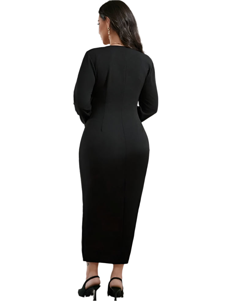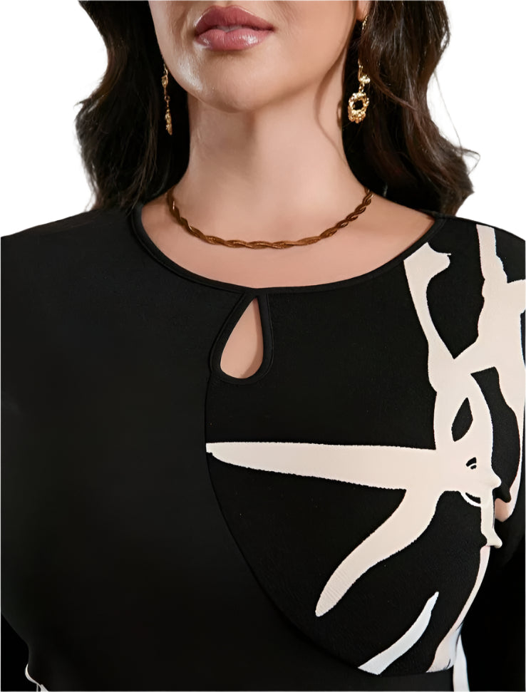 Címke nélküli, hosszú ujjú fekete midi ruha aszimmetrikus fehér mintával. Elegáns, testhezálló fazonja kiemeli az alakot, míg a kis nyakánál található kivágás különleges megjelenést kölcsönöz. Ideális választás alkalmi eseményekre vagy esti programokra.
