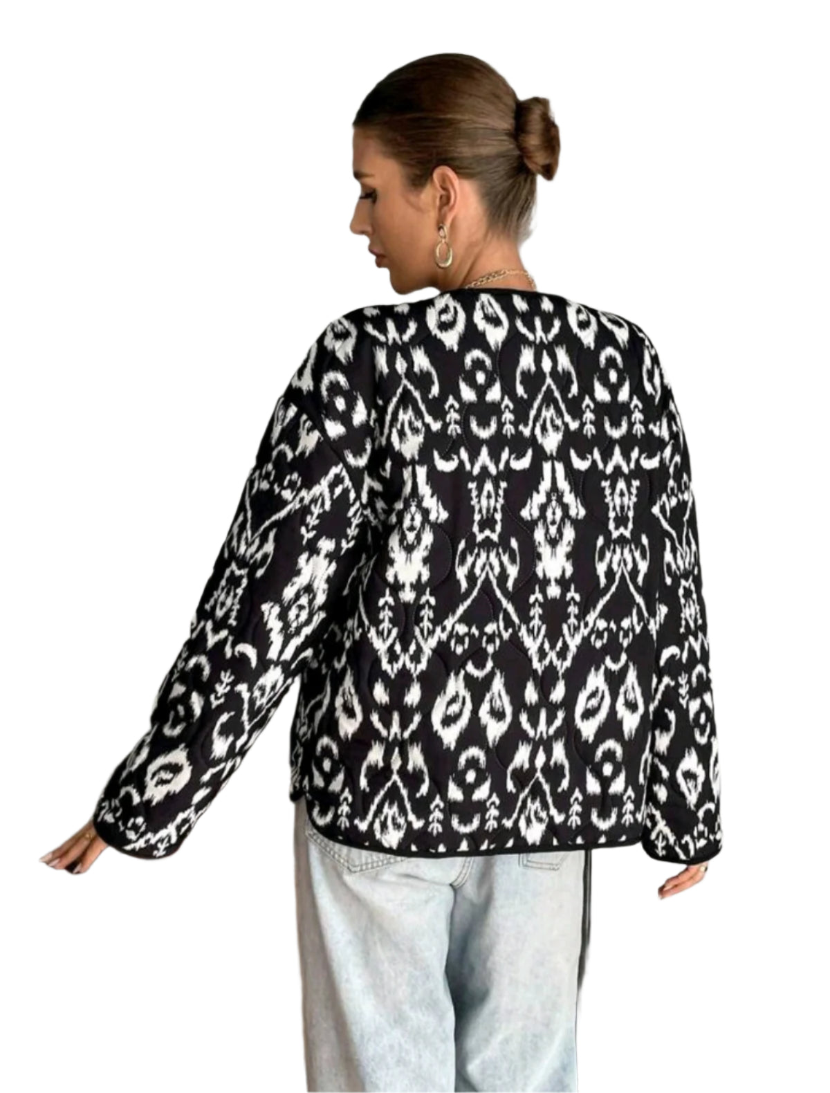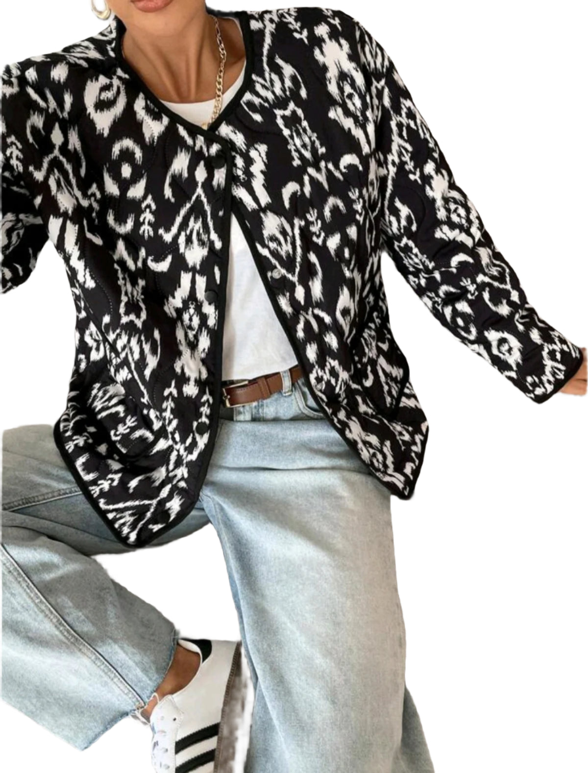 Címke nélküli, fekete-fehér absztrakt mintás, steppelt dzseki. Kerek nyakkivágás és gombos záródás biztosítja a kényelmes viseletet. Könnyed, trendi darab, amely tökéletes választás a hűvösebb napokra.
