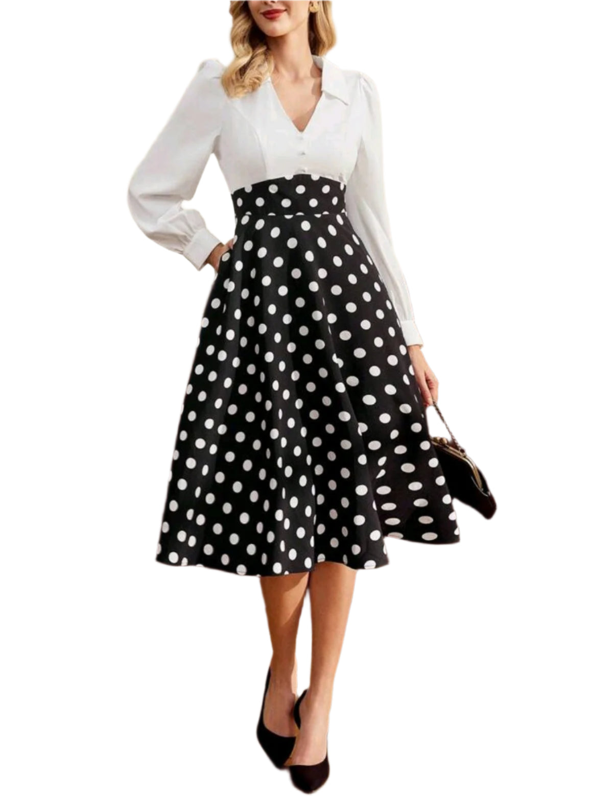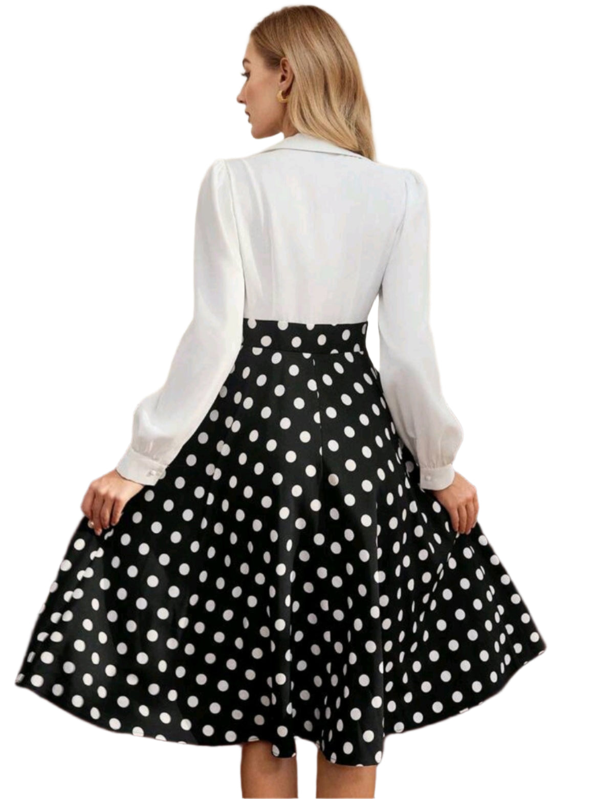 Címke nélküli, elegáns fekete-fehér pöttyös midi ruha. Fehér hosszú ujjú felsőrésze galléros kivágással és gombos díszítéssel klasszikus megjelenést biztosít, míg a derékhangsúlyos szabás és az A-vonalú szoknya nőies vonalakat kölcsönöz. A fekete alapon fehér pöttyös minta retró eleganciát ad a ruhának, amely tökéletes választás irodai viseletként, alkalmakra vagy elegáns hétköznapi outfitekhez.