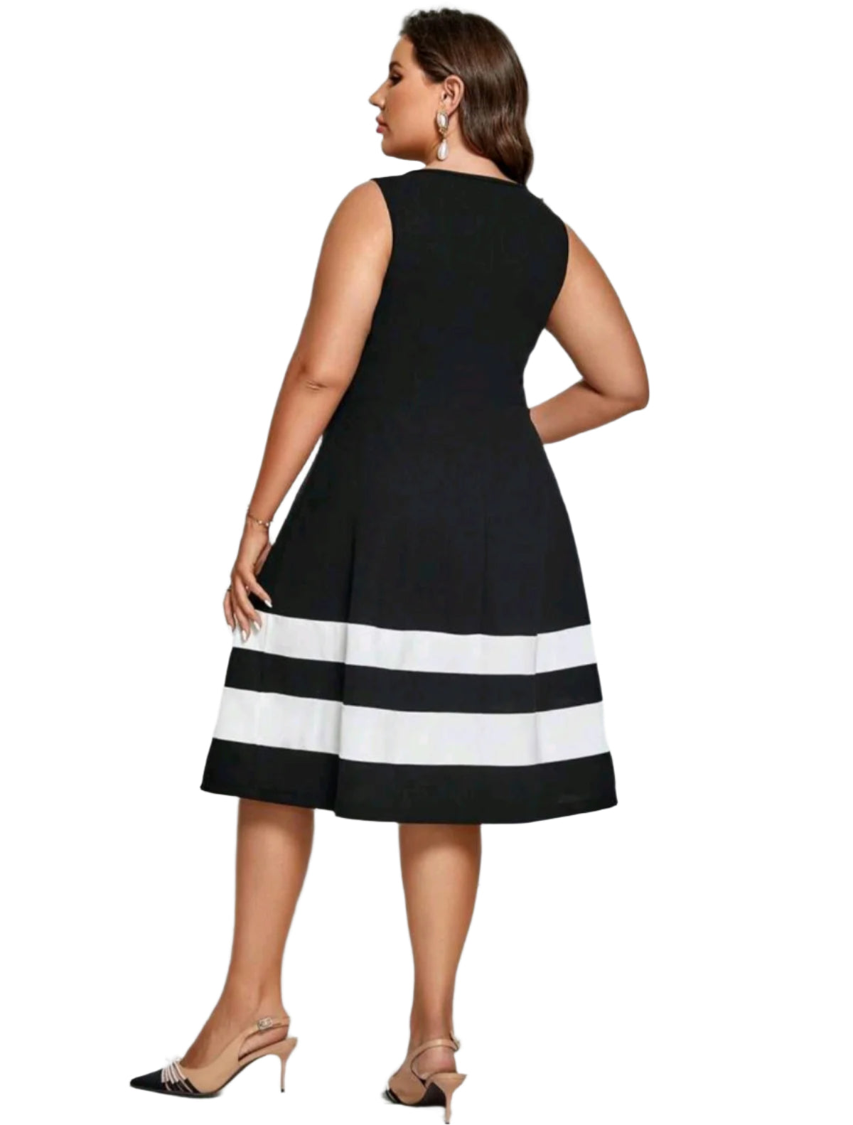 Címke nélküli, elegáns fekete midi ruha fehér csíkos szegéllyel. Klasszikus, ujjatlan kialakítása és finoman bővülő szoknyarésze nőies megjelenést biztosít. Kényelmes anyagának köszönhetően alkalmas üzleti, alkalmi és hétköznapi viseletre is.
