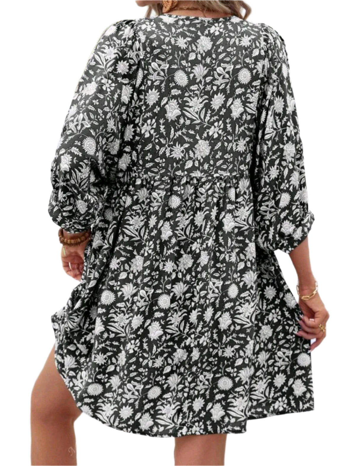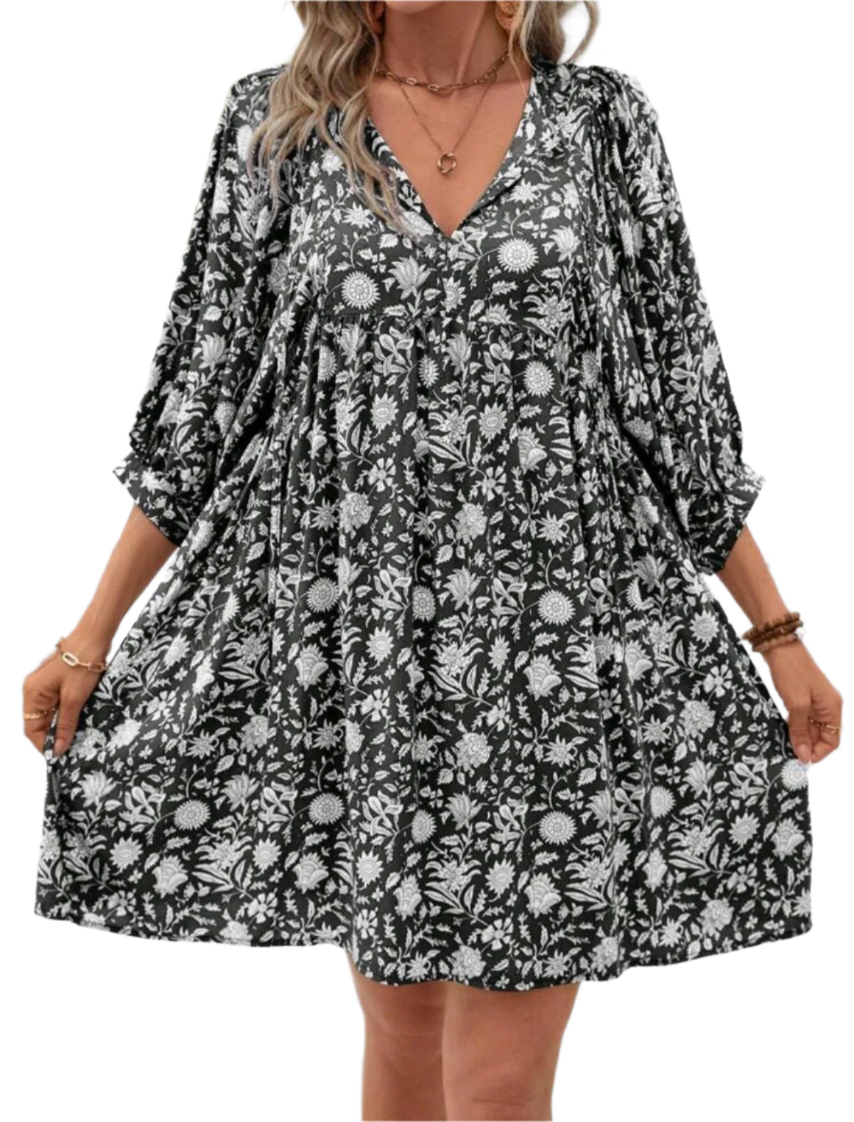 Címke nélküli, fekete alapon fehér virágmintás, bő szabású ruha. Kényelmes, laza fazonja tökéletes hétköznapi viseletre. V-nyakkivágása és háromnegyedes bő ujjai nőies és légies megjelenést biztosítanak. Rövid, A-vonalú kialakítása könnyed mozgást garantál.