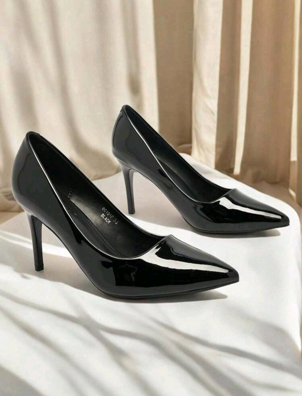 Címke nélküli, lakkozott fekete felületű, klasszikus tűsarkú cipő. Hegyes orrú kialakítása elegáns megjelenést biztosít, a vékony magas sarok pedig kihangsúlyozza a nőies vonalakat. Tökéletes választás alkalmi eseményekre, irodai megjelenéshez vagy elegáns esti programokhoz.