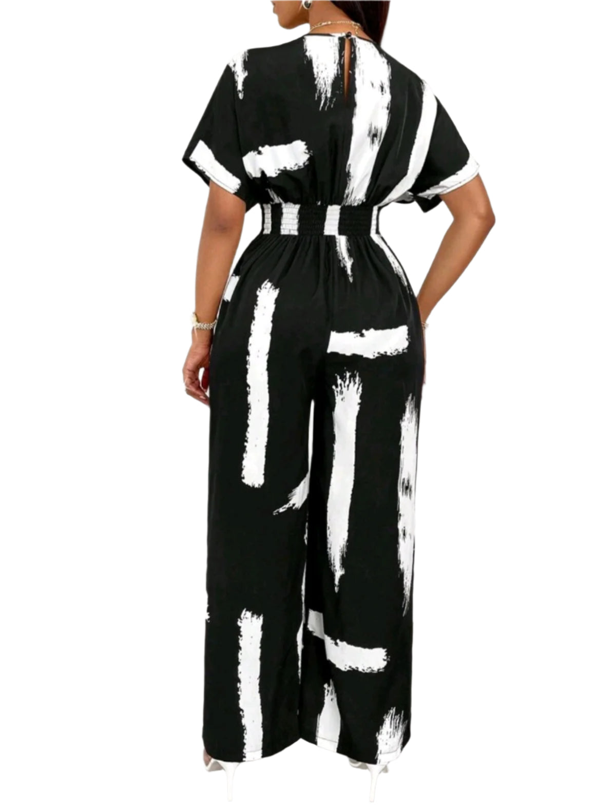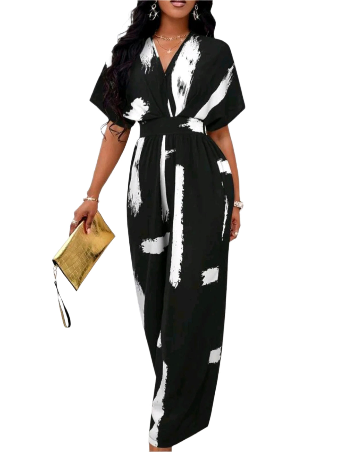 Címke nélküli, könnyed esésű, fekete alapon fehér ecsetvonás mintás overál. Rövid ujjú, V-nyakkivágású, karcsúsított derékrésszel és egyenes szárú nadrágrésszel. Légies anyagának és elegáns fazonjának köszönhetően ideális választás alkalmi eseményekre vagy különleges hétköznapokra.