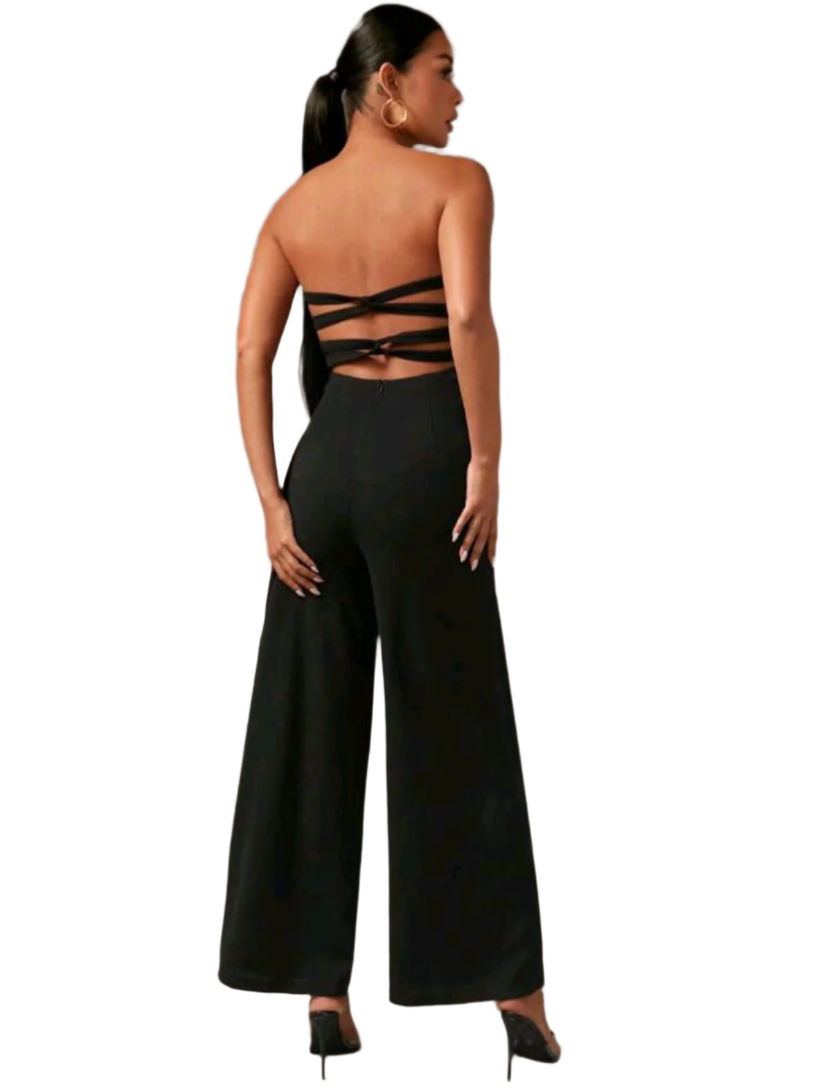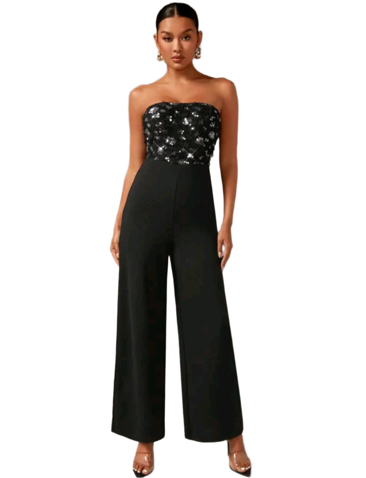 Címke nélküli, elegáns fekete overál, flitterekkel díszített pánt nélküli felsőrésszel. A testhez simuló felsőrész és az egyenes szabású, bő nadrágszár tökéletes egyensúlyt teremt. Ideális választás alkalmi eseményekre, estélyekre vagy ünnepi vacsorákhoz.