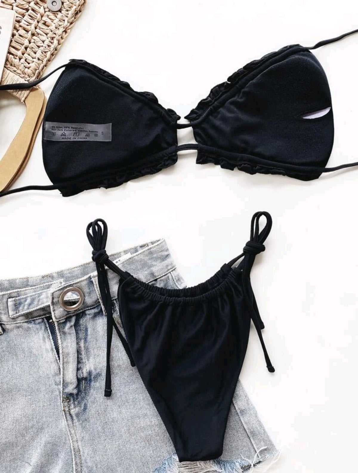 Címke nélküli, fekete színű, sima anyag, fodros szegélyű háromszög fazonú felsőrész vékony pántokkal, oldalt megkötős alsó.