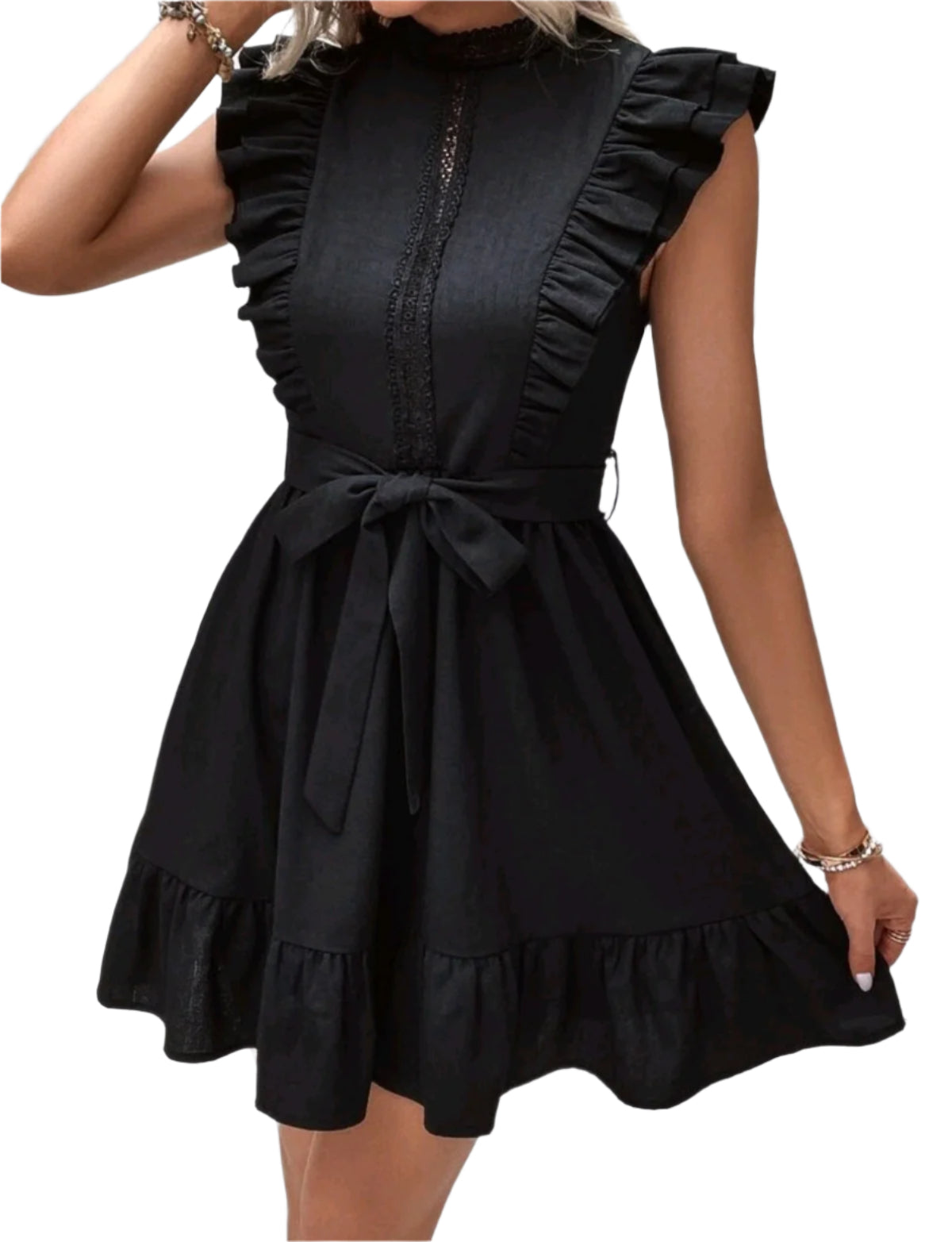Címke nélküli, elegáns fekete miniruha fodros ujjrészekkel és csipkés részletekkel. Magas nyakú kialakítása és derékon megkötős öve nőies és romantikus megjelenést biztosít. Alkalmas alkalmi eseményekre, randira vagy nyári viseletre.