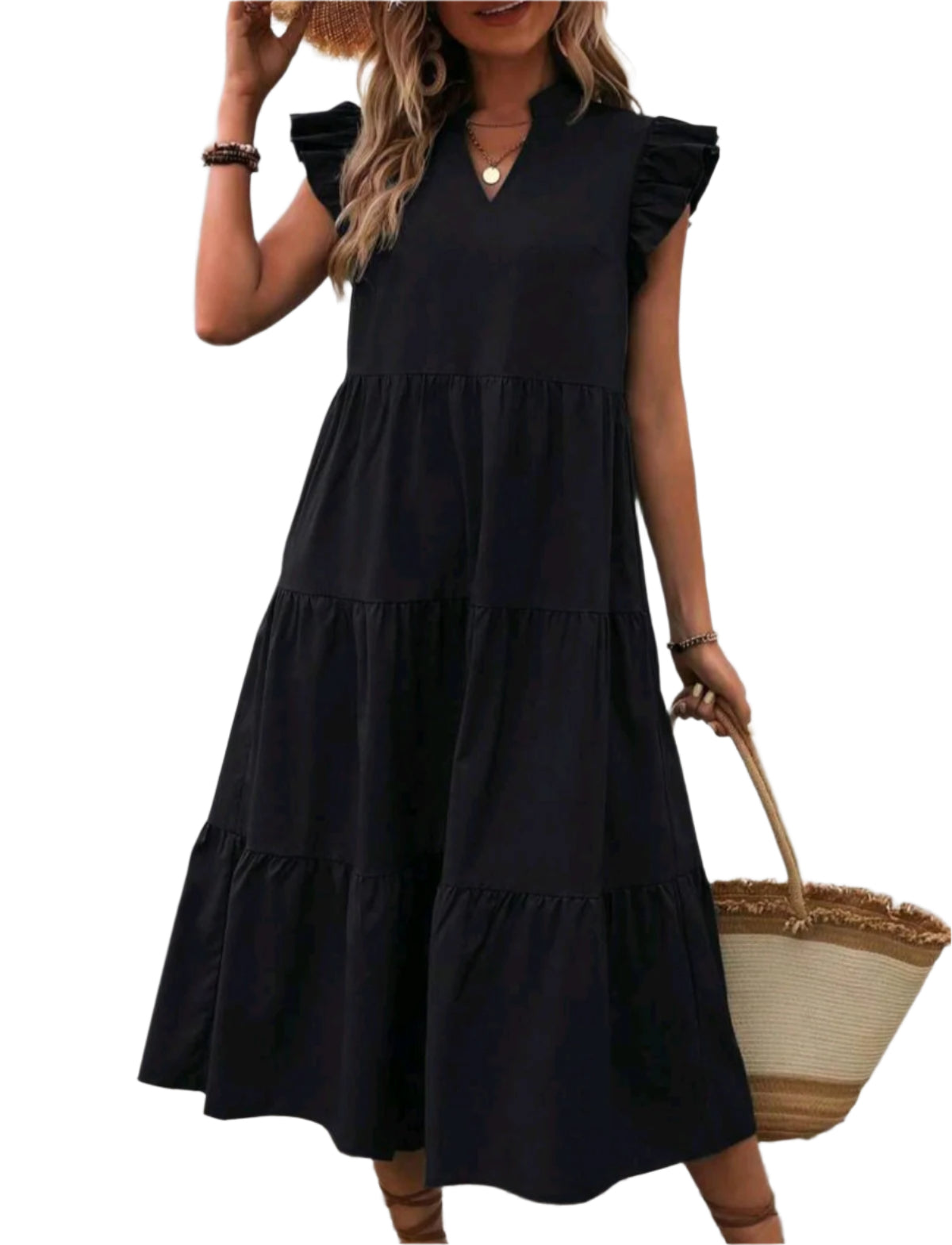 Címke nélküli, fekete, fodros ujjú maxi ruha V-kivágással és többrétegű, bő szabású szoknyarésszel. Könnyed és kényelmes viselet, amely tökéletes választás nyári sétákhoz, hétköznapi vagy akár elegáns alkalmakra is.