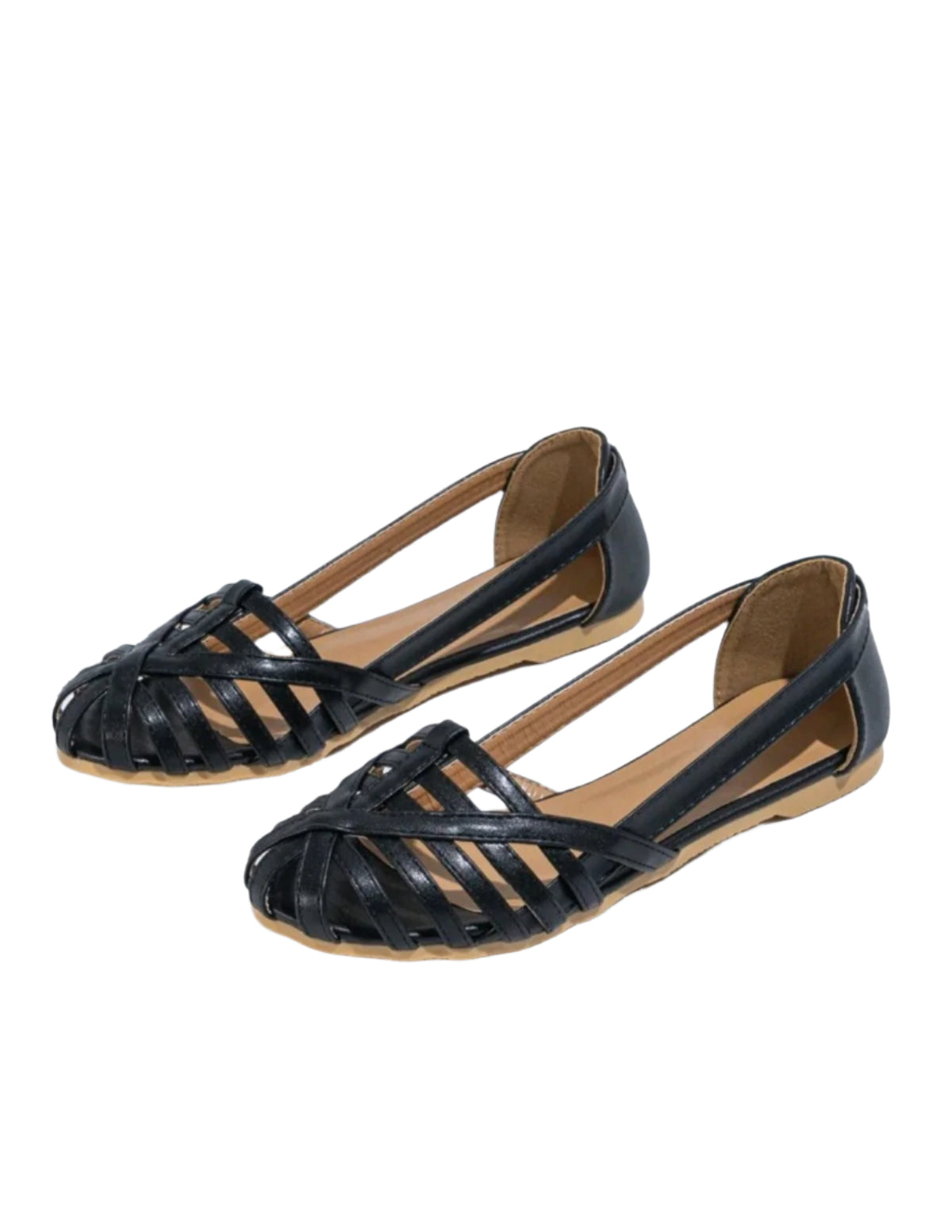 Címke nélküli, könnyed és stílusos fekete balerina cipő fonott pántokkal, amely szellős kialakításának köszönhetően kényelmes viselet a melegebb napokon. Lapos talpa biztosítja a stabil járást, míg a klasszikus, nyitott oldalsó rész elegáns megjelenést kölcsönöz. Ideális hétköznapi és alkalmi viseletre egyaránt.