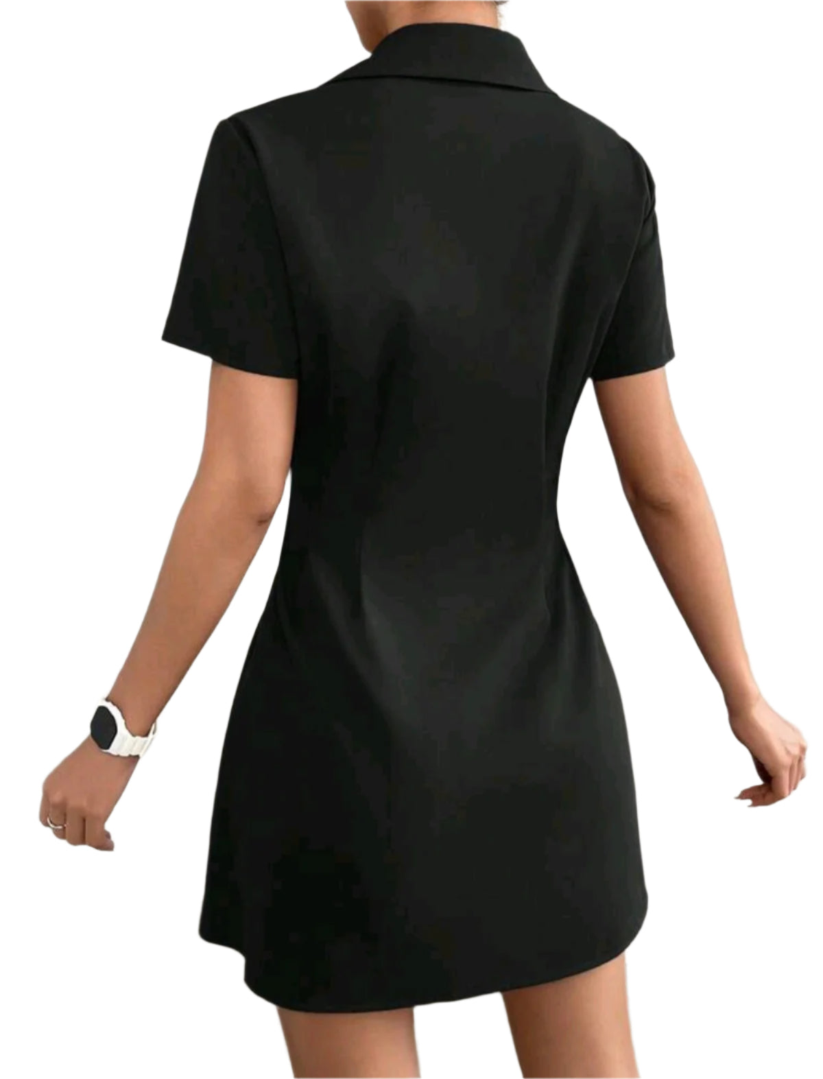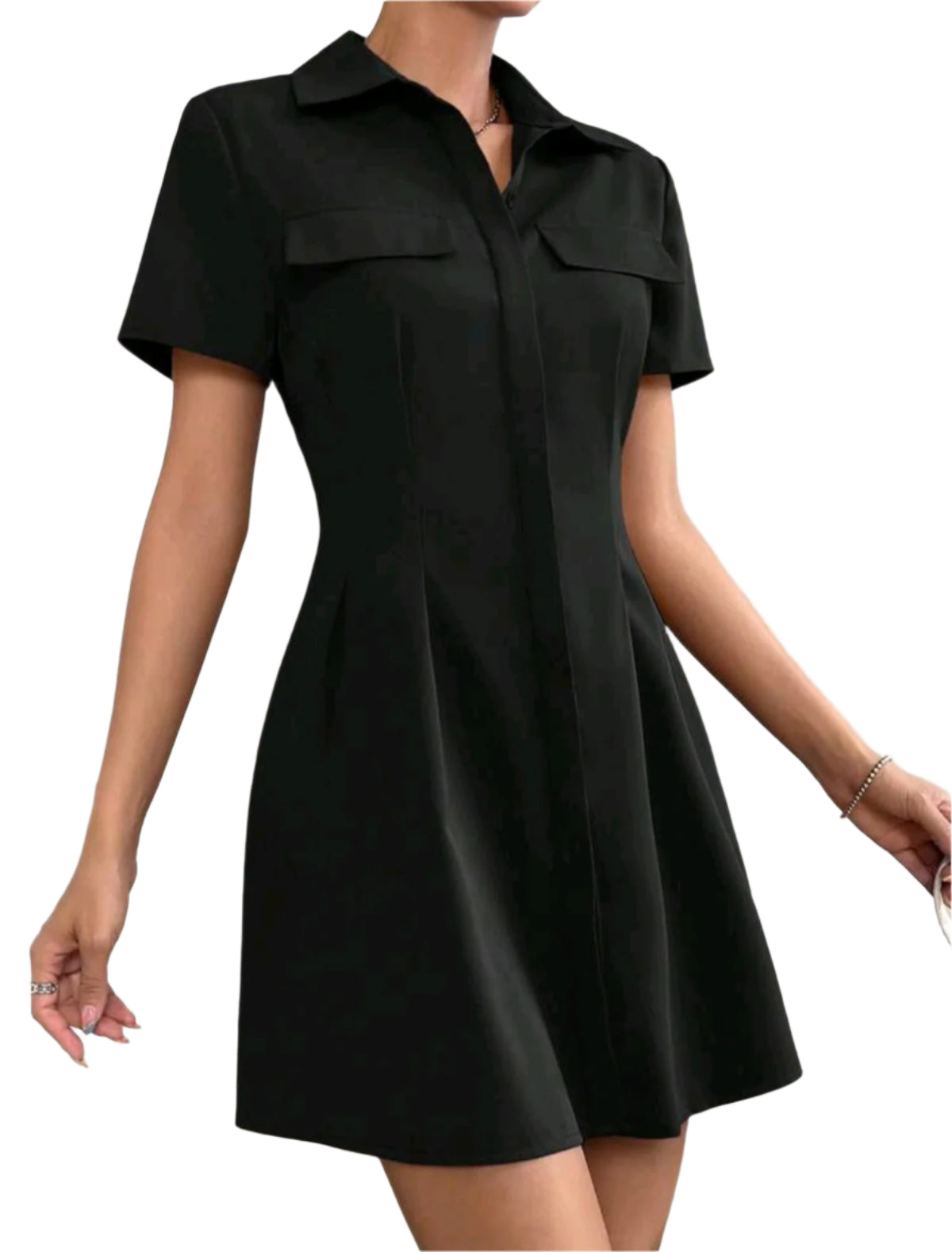 Címke nélküli, klasszikus galléros fazonú, rövid ujjú mini ruha letisztult szabással. A mellrészen díszzsebekkel, rejtett gombsorral és enyhén A-vonalú szoknyával rendelkezik, amely nőies sziluettet biztosít. Ideális hétköznapi viseletre vagy irodai szettekhez egyaránt.