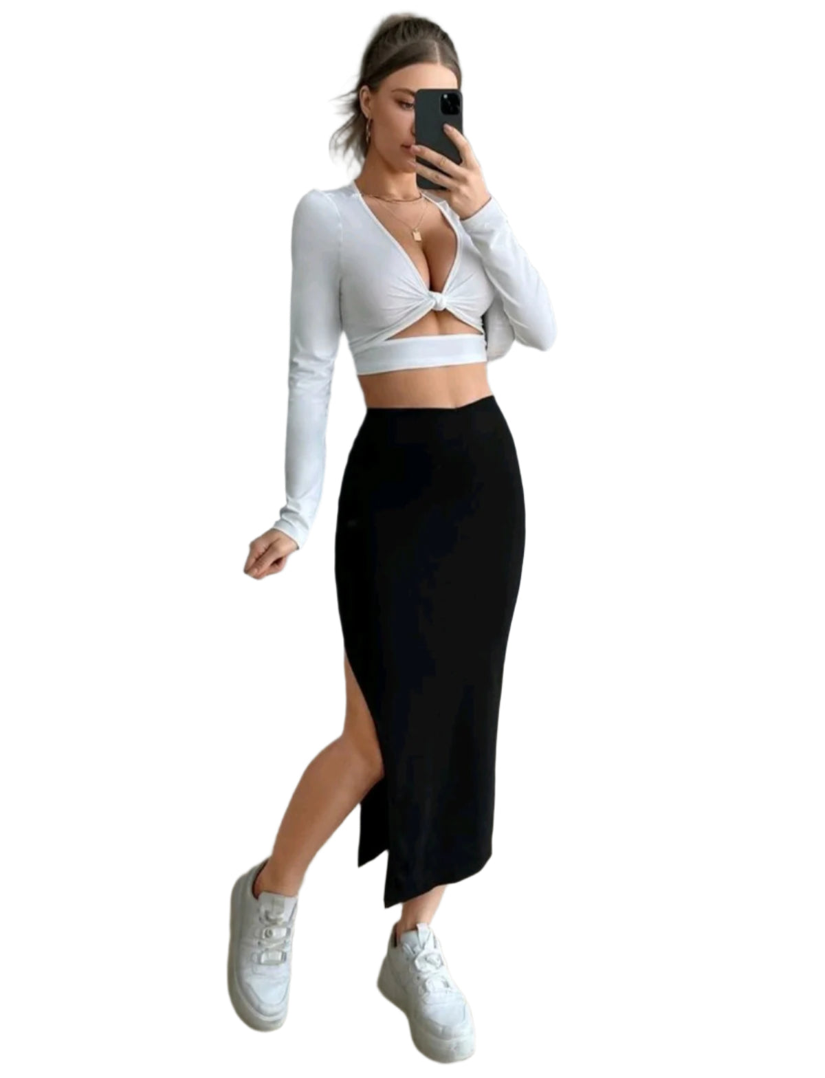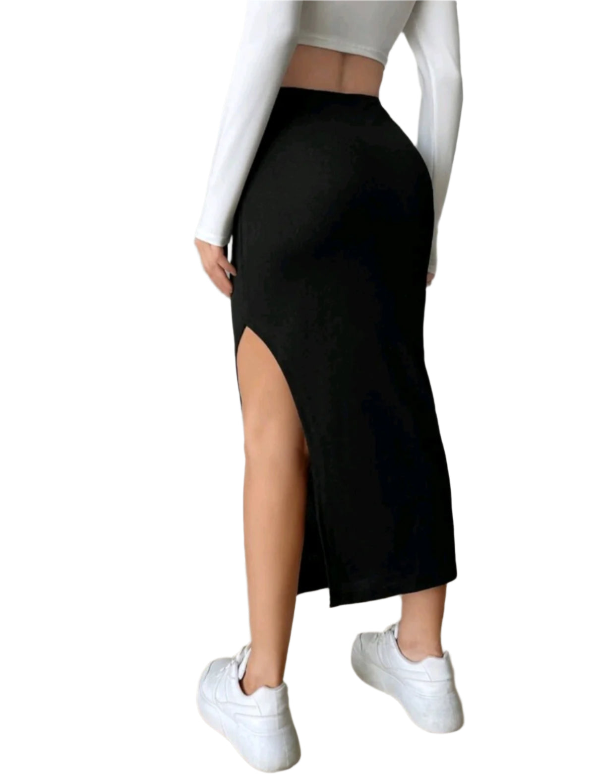 Címke nélküli, fekete, magas derekú midi szoknya. Egyszerű, elegáns fazon, amely egy oldalsó sliccel teszi különlegessé a megjelenést. Rugalmas anyagának köszönhetően kényelmes viselet, tökéletes választás hétköznapi és alkalmi outfitekhez is.