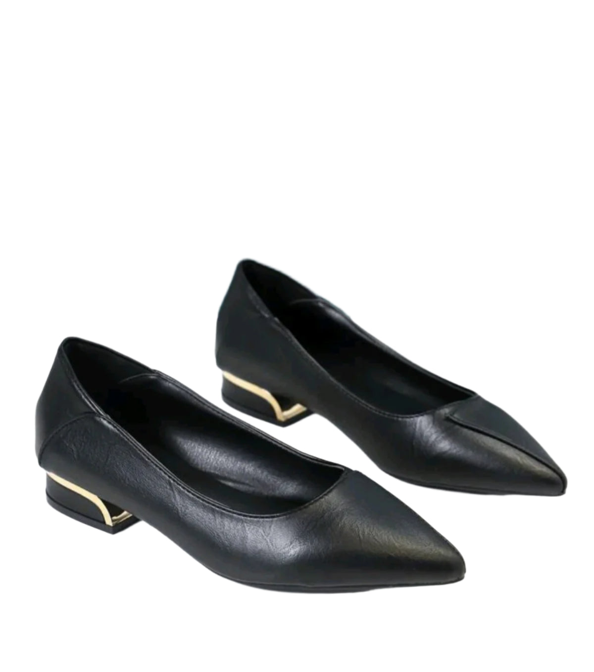 Címke nélküli, elegáns és letisztult fekete lapos cipő, hegyes orral és egyedi arany díszítésű sarokkal. Kényelmes és stílusos választás mindennapi viseletre, irodai megjelenéshez vagy alkalmi eseményekhez.