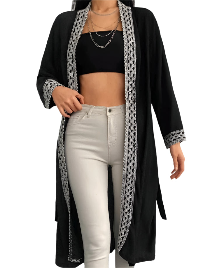 Címke nélküli, fekete, hosszú fazonú boho stílusú kardigán, kontrasztos hímzett szegélyekkel. Laza, könnyed szabásának köszönhetően tökéletes rétegezéshez, stílusos kiegészítője lehet bármely hétköznapi vagy fesztivál szettnek. Nyitott fazonú, hosszú ujjú kialakítása kényelmes és légies viseletet biztosít. Ideális választás tavaszi és őszi időszakra, bohém stílus kedvelőinek.