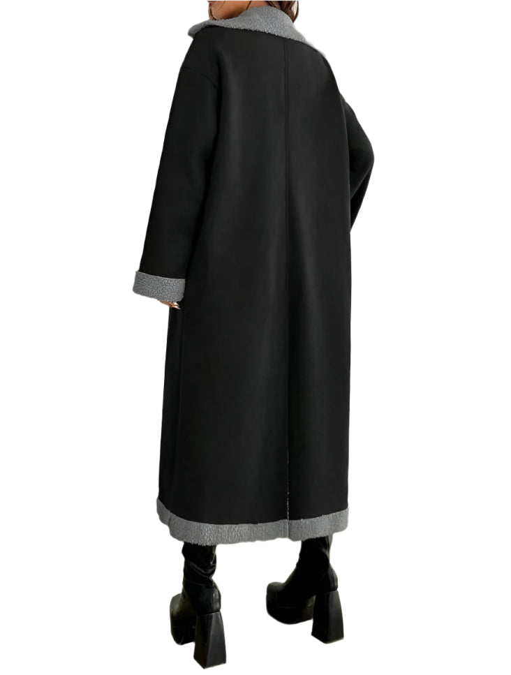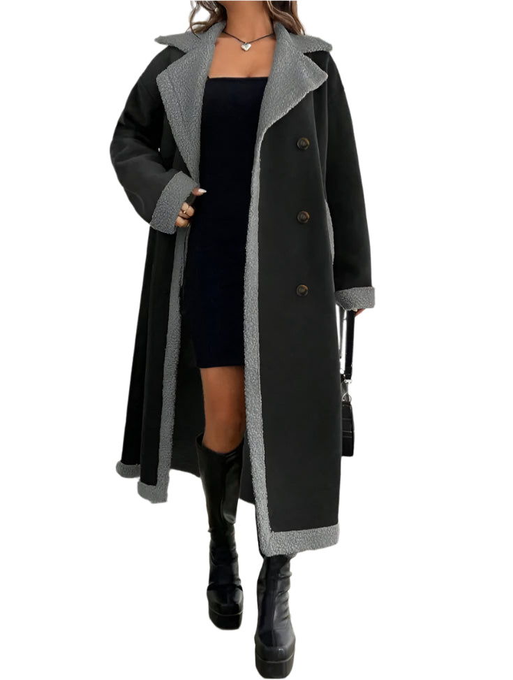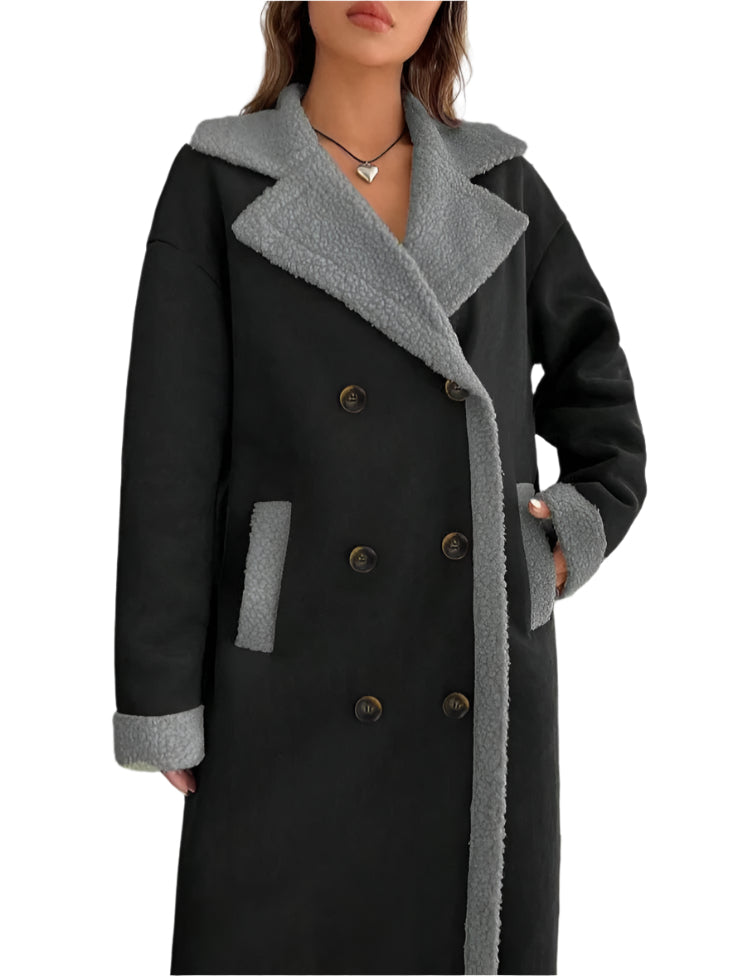 Címke nélküli, elegáns hosszú kabát műszőrme béléssel, amely tökéletes választás a hideg hónapokra. Kényelmes, stílusos és könnyen kombinálható bármilyen outfithez. Kettős gombolásával és puha belső rétegével egyszerre biztosít meleget és divatos megjelenést.