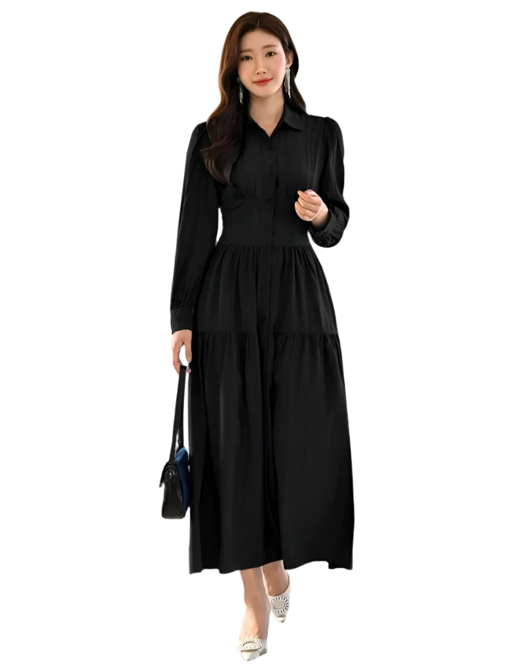 Címke nélküli, fekete, hosszú ujjú ingruha, elegáns és visszafogott stílusban. Klasszikus galléros nyakkivágással, elöl végig gombolható kialakítással, amely letisztult megjelenést biztosít. Derékban szűkített szabása kiemeli az alakot, míg a hosszú, bővülő szoknyarész nőies és elegáns hatást kelt. Könnyed, légáteresztő anyaga kényelmes viseletet biztosít egész napra. Ideális választás munkahelyi öltözetként, alkalmi eseményekre vagy hétköznapi eleganciához.