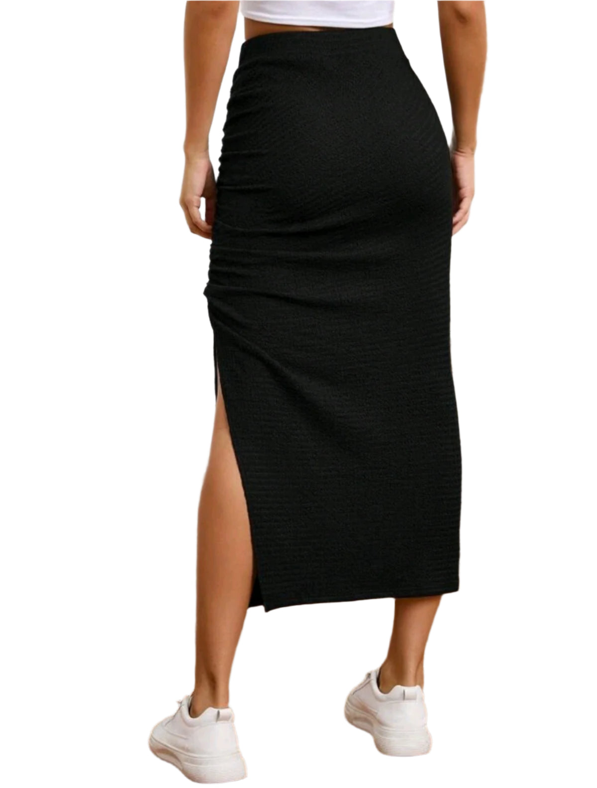 Címke nélküli, fekete, testhezálló midi szoknya. Oldalt húzott kialakítással és combközépig érő sliccel, amely nőies és elegáns megjelenést kölcsönöz. Rugalmas, puha anyagból készült, kényelmes viselet hétköznapokra vagy alkalmi szettekhez is.