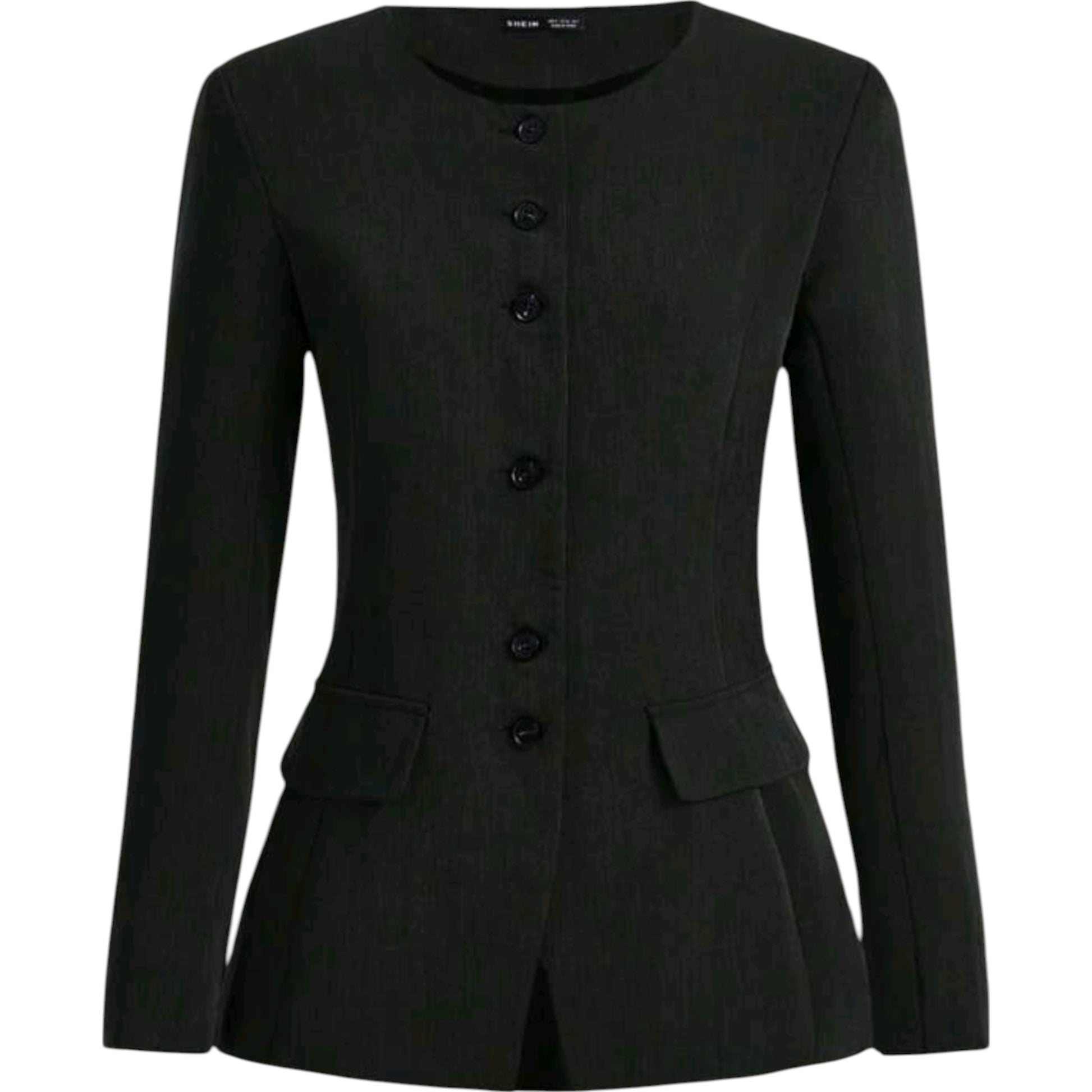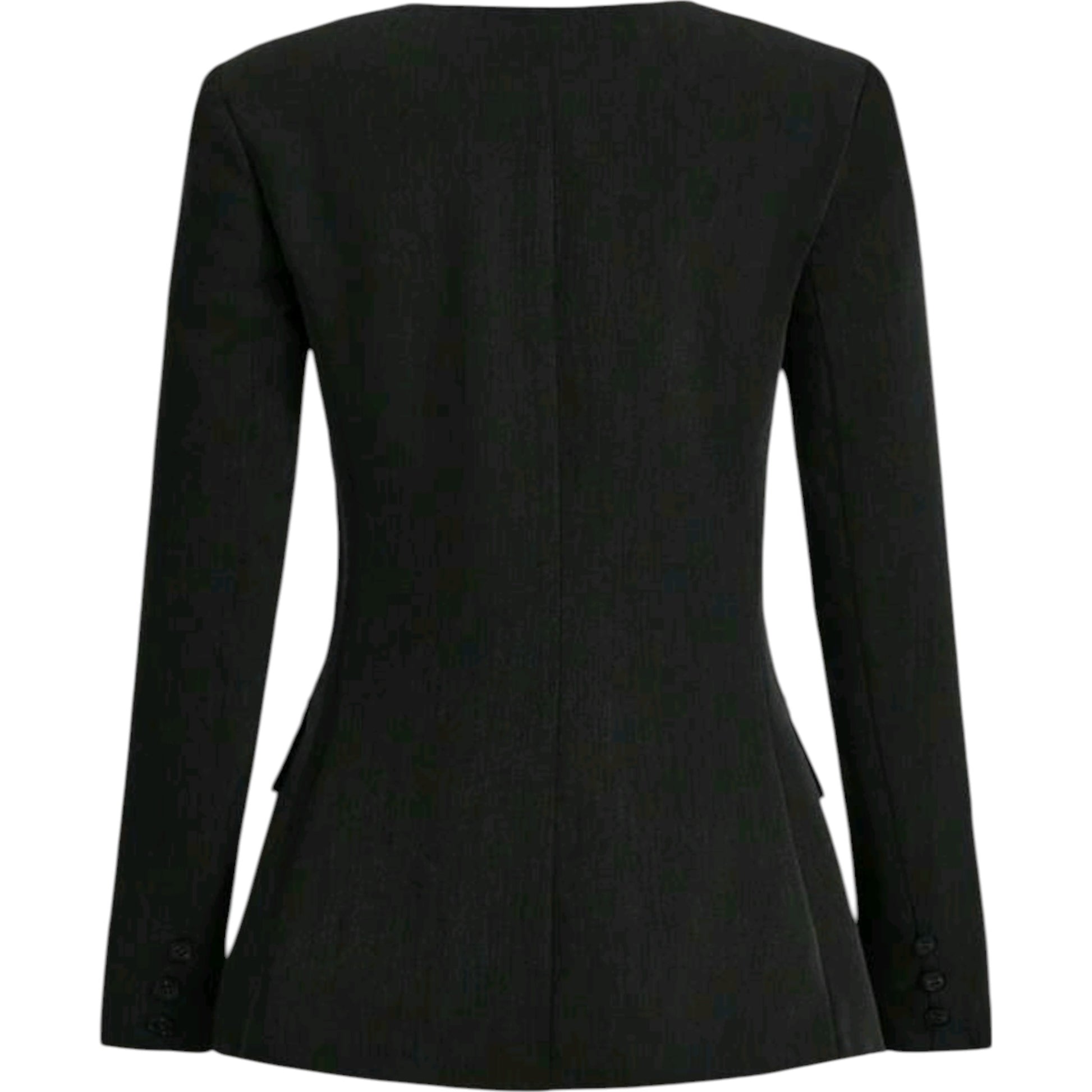 Címke nélküli, fekete, kereknyakú, gombolós, hosszú ujjú blézer zsebekkel.