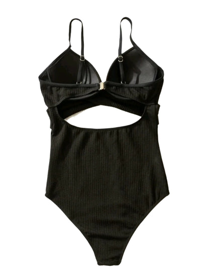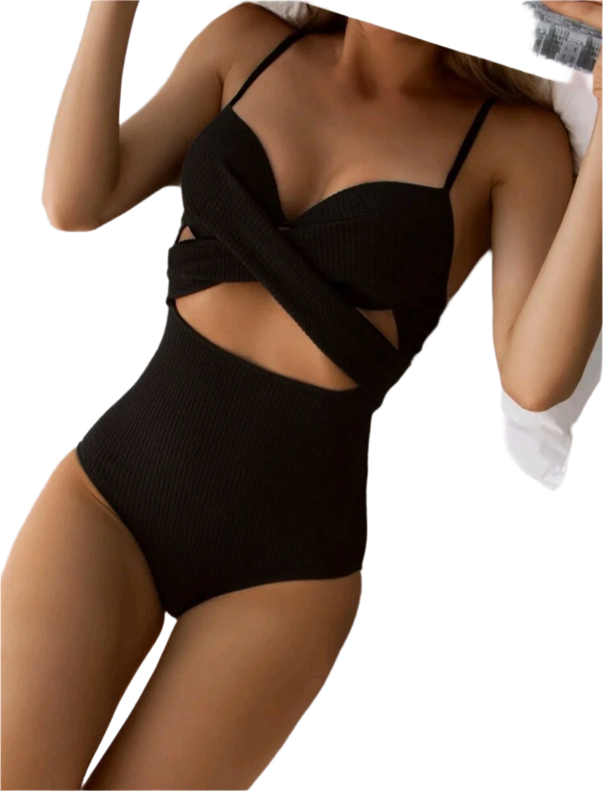 Címke nélküli, fekete színű, texturált anyagú egyberészes fürdőruha, mély V-nyakkivágással, vékony vállpántokkal, keresztpántos hasítékkal a derékrészen, nőies és elegáns megjelenéshez.