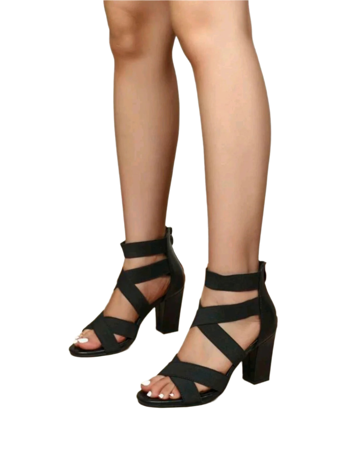 Címke nélküli, fekete szandál rugalmas keresztpántokkal és vastag, stabil sarokkal. A cipzáros hátoldal kényelmes felvételt biztosít, míg az elegáns és modern design alkalmi és hétköznapi viselethez is ideális választás.