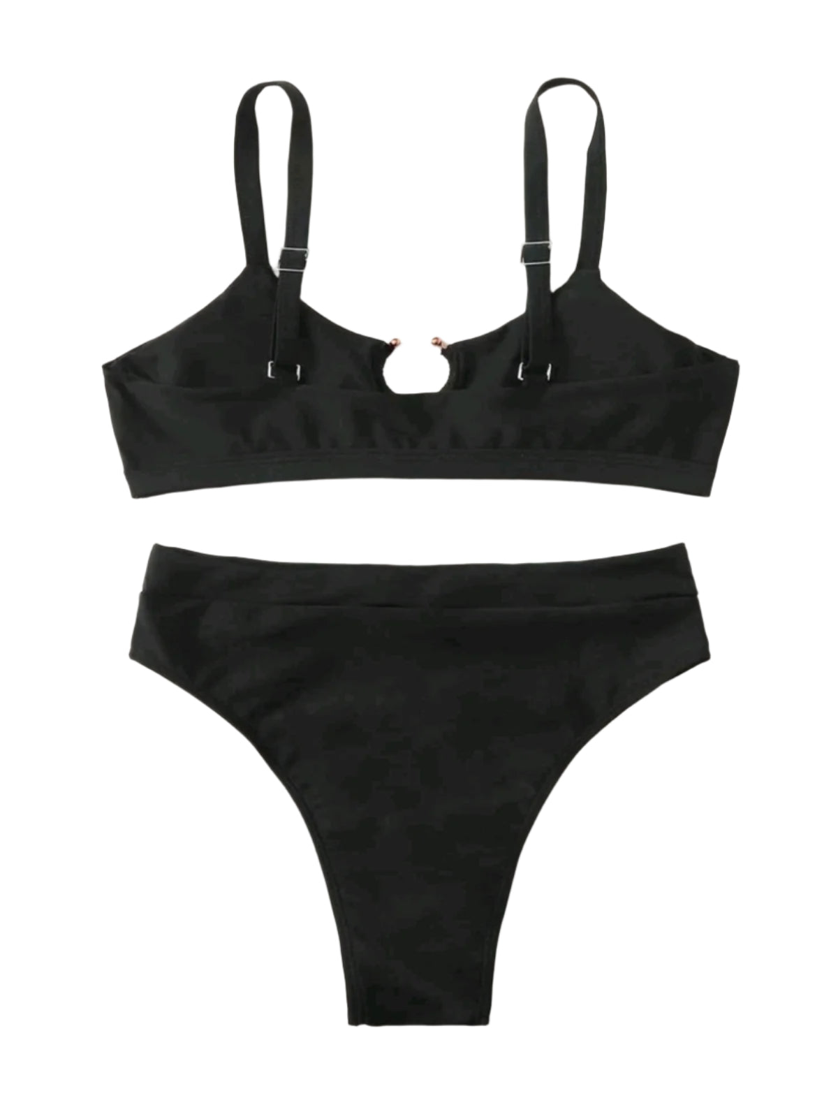 Címke nélküli, fekete, sima anyag, merevítős felsőrész középen fém díszítéssel, magas derekú alsó, klasszikus szabású fazon.