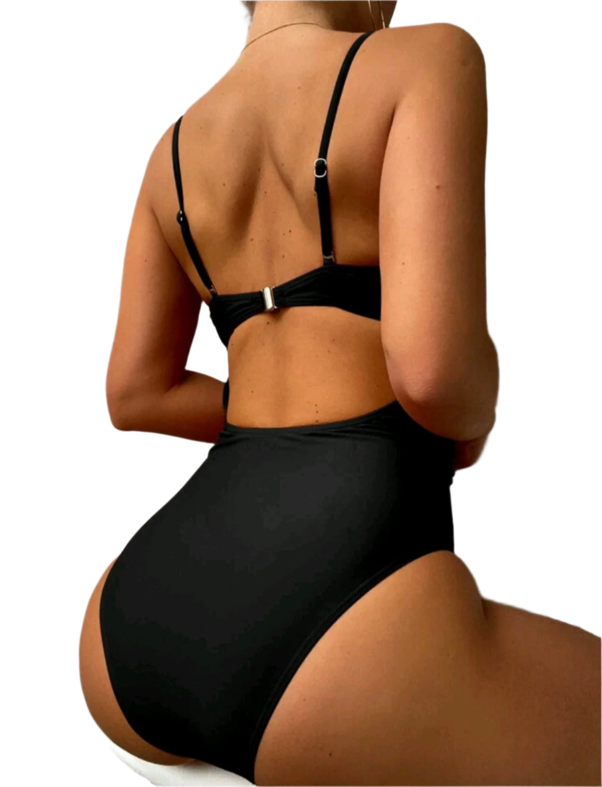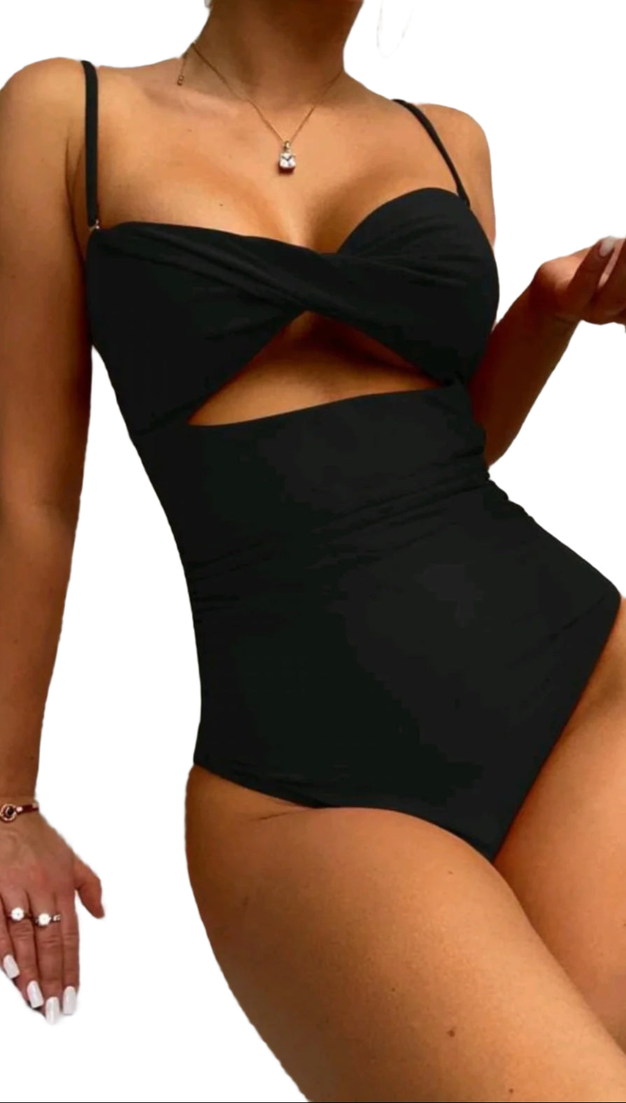 Címke nélküli, női egyrészes fürdőruha, nyári, klasszikus fekete színben, csavart mellrész kialakítással és alatta trendi kivágással, állítható spagettipántokkal, magas derekú, karcsúsító szabás, elegáns és nőies megjelenés, rugalmas és kényelmes anyagból, tökéletes választás strandoláshoz és medencés partikhoz.