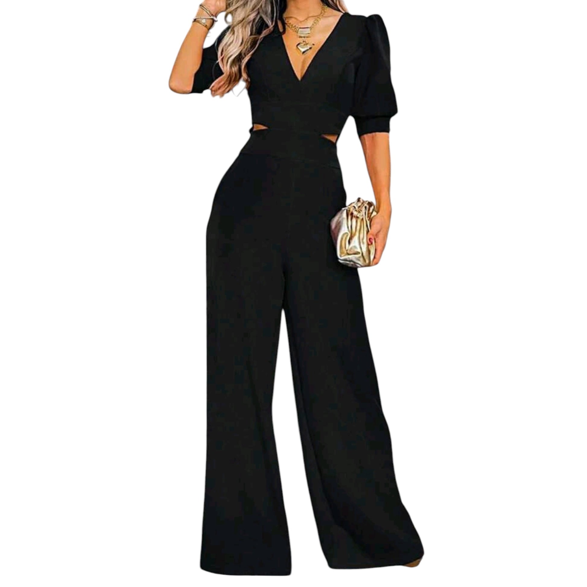 Címke nélküli, fekete, V-nyakú, puffos rövid ujjú, derékban kivágott, széles szárú.