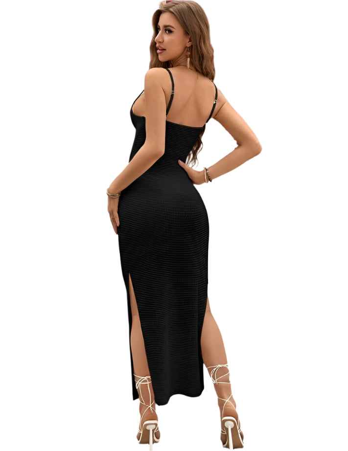 Címke nélküli, fekete maxi ruha. Testhezálló szabásával és elöl megkötős kivágott részletével igazán nőies és elegáns megjelenést biztosít. Spagettipántos kialakítása nyári alkalmakra tökéletes választás.