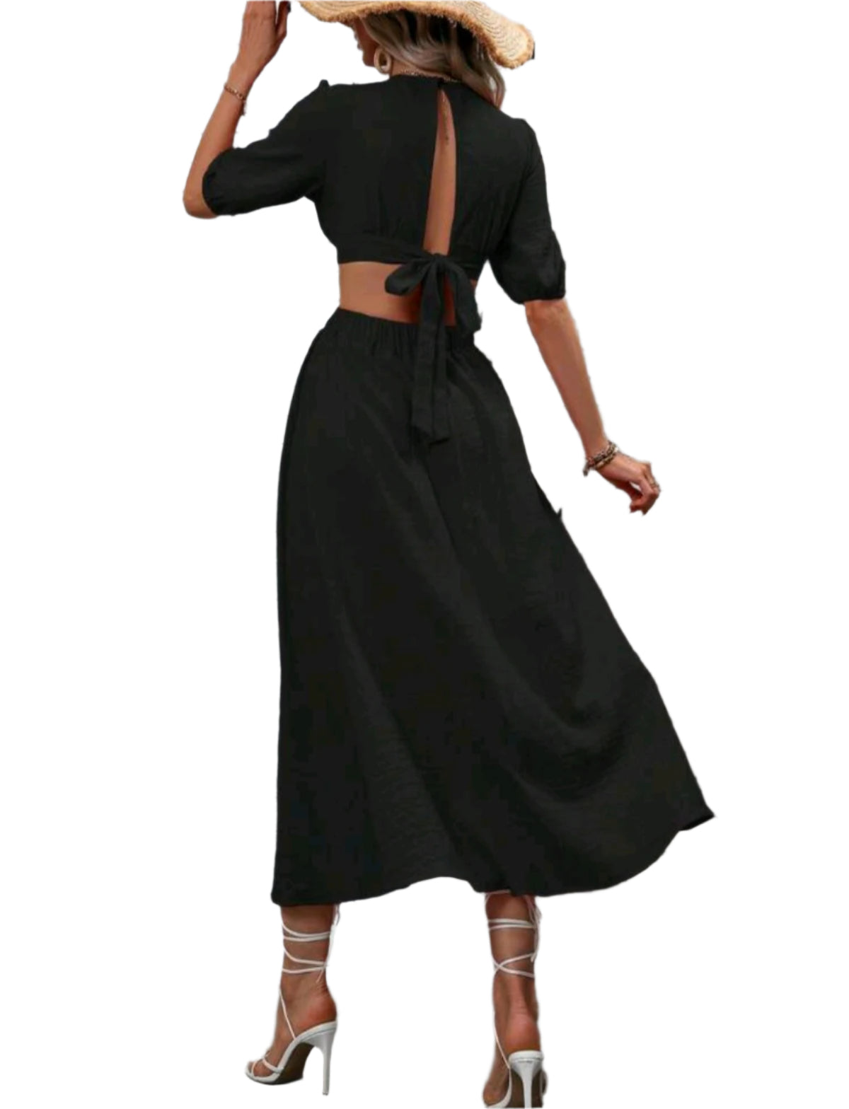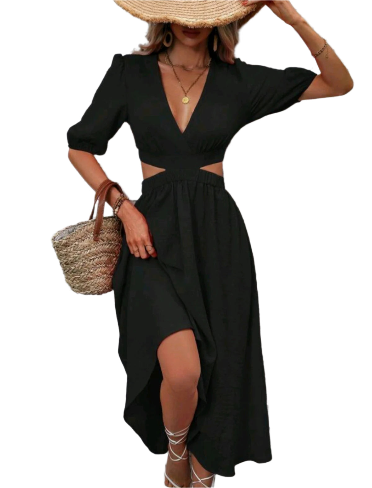 Címke nélküli, fekete, könnyed nyári midi ruha merész oldalsó kivágásokkal és V-kivágású felsőrésszel. Rövid puffos ujjai romantikus megjelenést kölcsönöznek, míg a derékrészen található gumírozás kényelmes illeszkedést biztosít. A lágyan bővülő, aszimmetrikus szoknyarész szellős és elegáns hatást kelt. Tökéletes választás nyári sétákhoz, tengerparti nyaralásokhoz vagy bohém hangulatú eseményekhez.