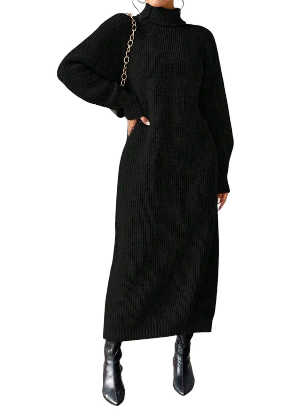 Címke nélküli, fekete, kötött, ruha, garbós, hosszú ujjú, midi hosszúságú.