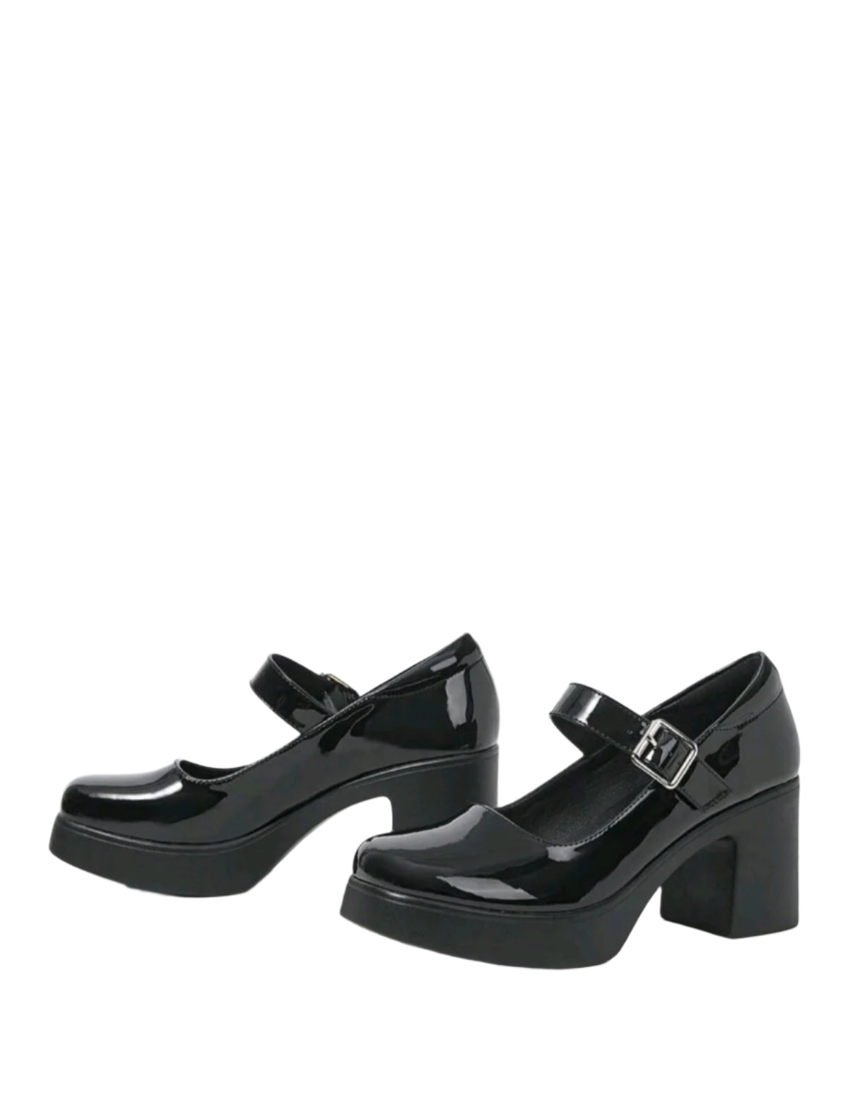 Címke nélküli, fényes fekete lakkozott cipő állítható pánttal és ezüst csattal. Kényelmes platformtalppal és vastag sarokkal készült, ami stabil járást biztosít. Klasszikus fazon modern megjelenéssel, tökéletes választás hétköznapi vagy irodai viselethez, illetve elegánsabb alkalmakra is.