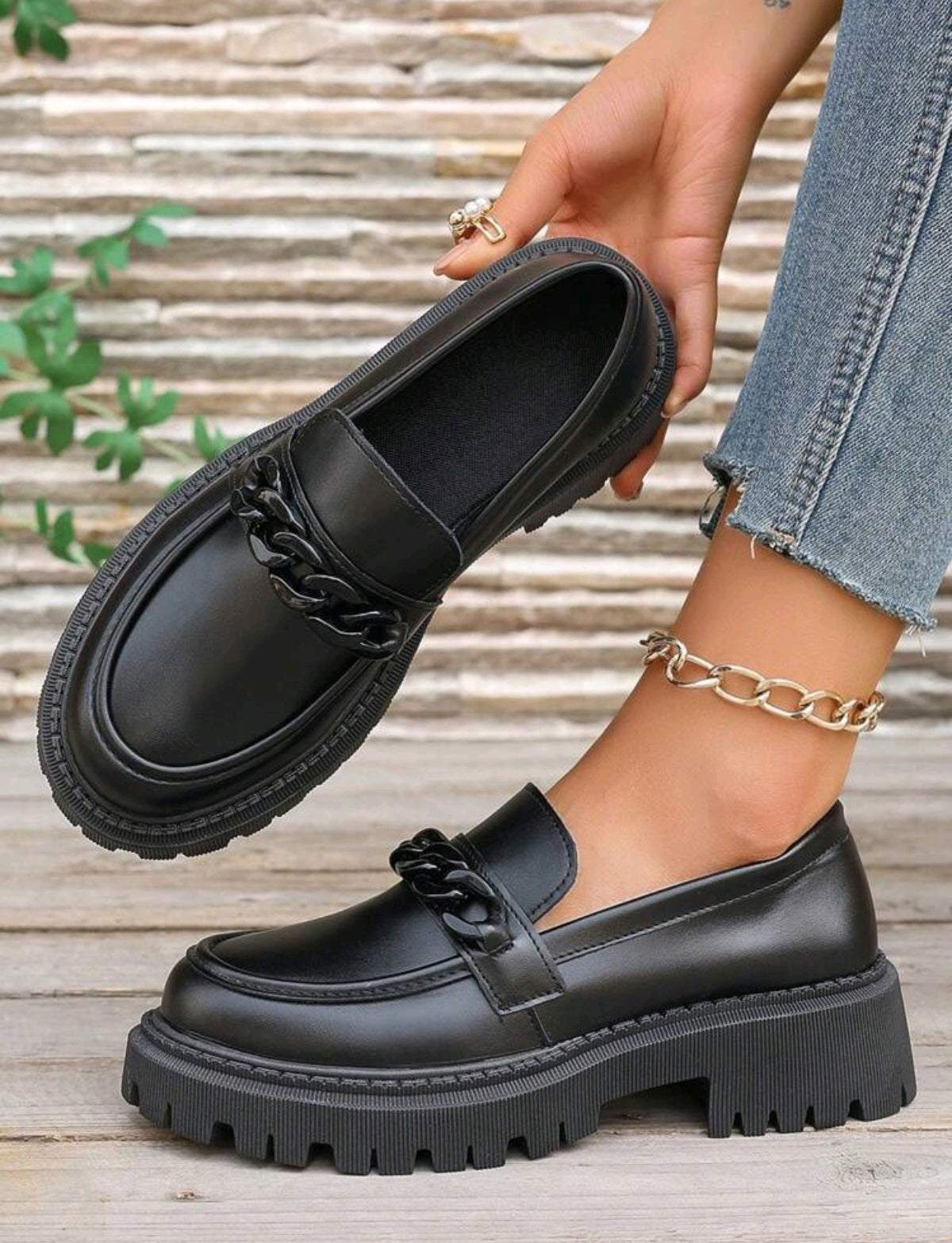 Címke nélküli, fekete műbőr loafer fényes láncdísszel az orr részen, vastag, bordázott gumitalppal és kényelmes slip-on fazonnal. Divatos és praktikus választás a hétköznapokra, iskolába vagy városi sétákhoz.
