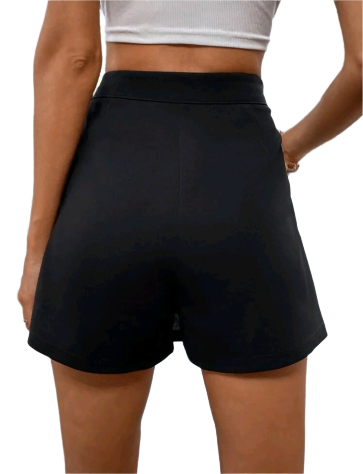 Címke nélküli, fekete színű, magas derekú rövidnadrág letisztult dizájnnal. Kényelmes, enyhén bővebb szabású fazon, amely tökéletes választás nyári viseletként vagy sportos, laza összeállításokhoz.