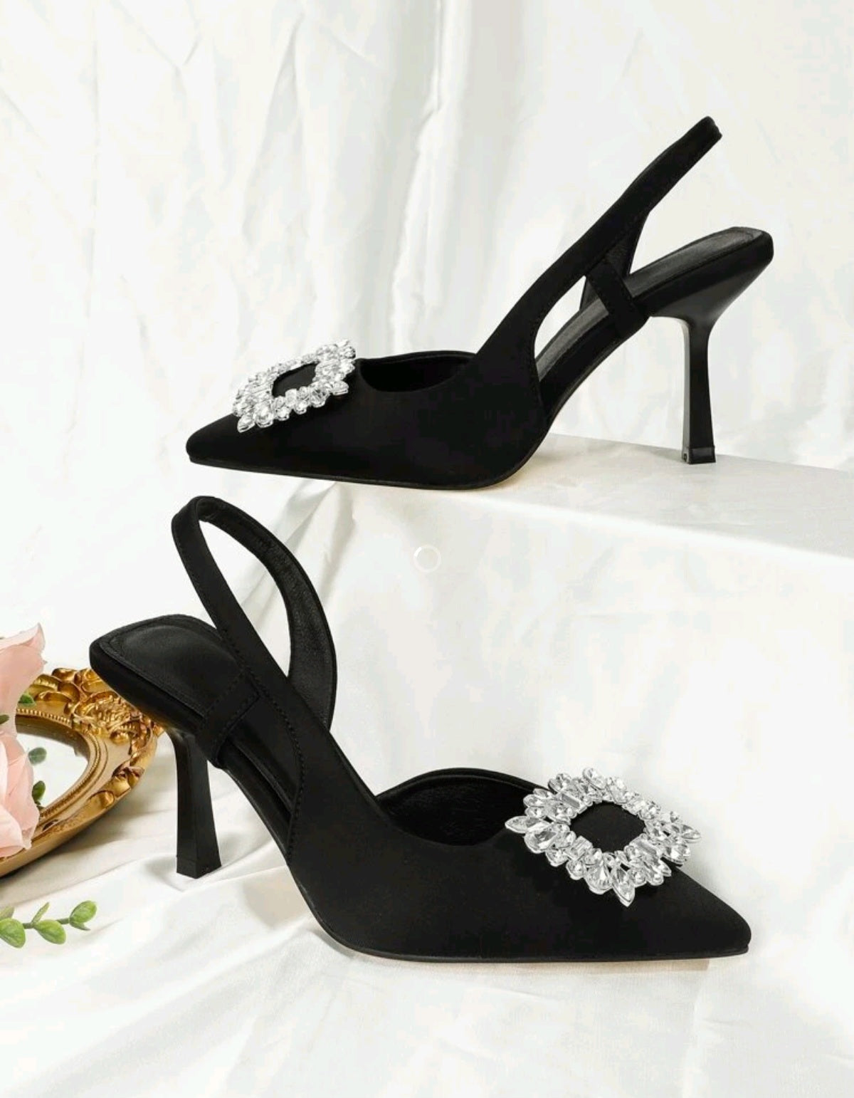 Címke nélküli, elegáns fekete színű magas sarkú szlingback cipő, díszes kristályos ékszerrel a hegyes orr részen. Kifinomult és nőies megjelenés, amely tökéletes választás esküvőre, bálra, vagy elegáns esti alkalmakra.