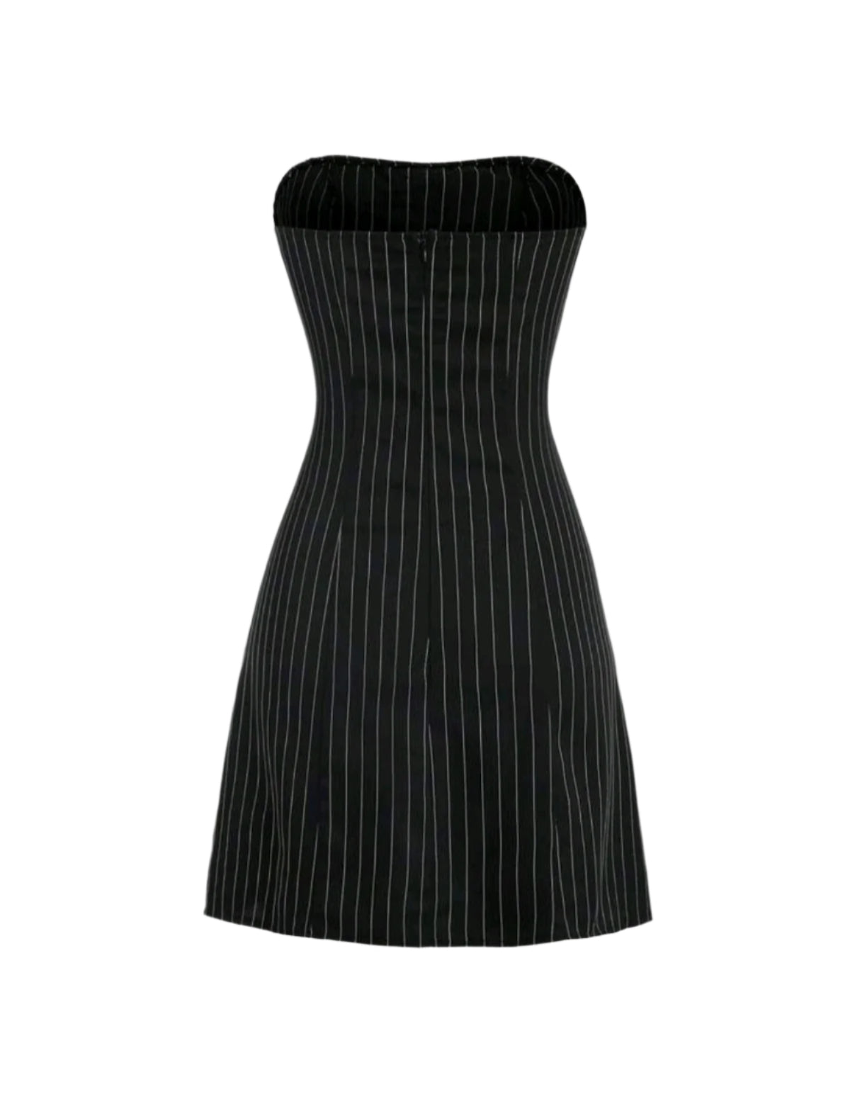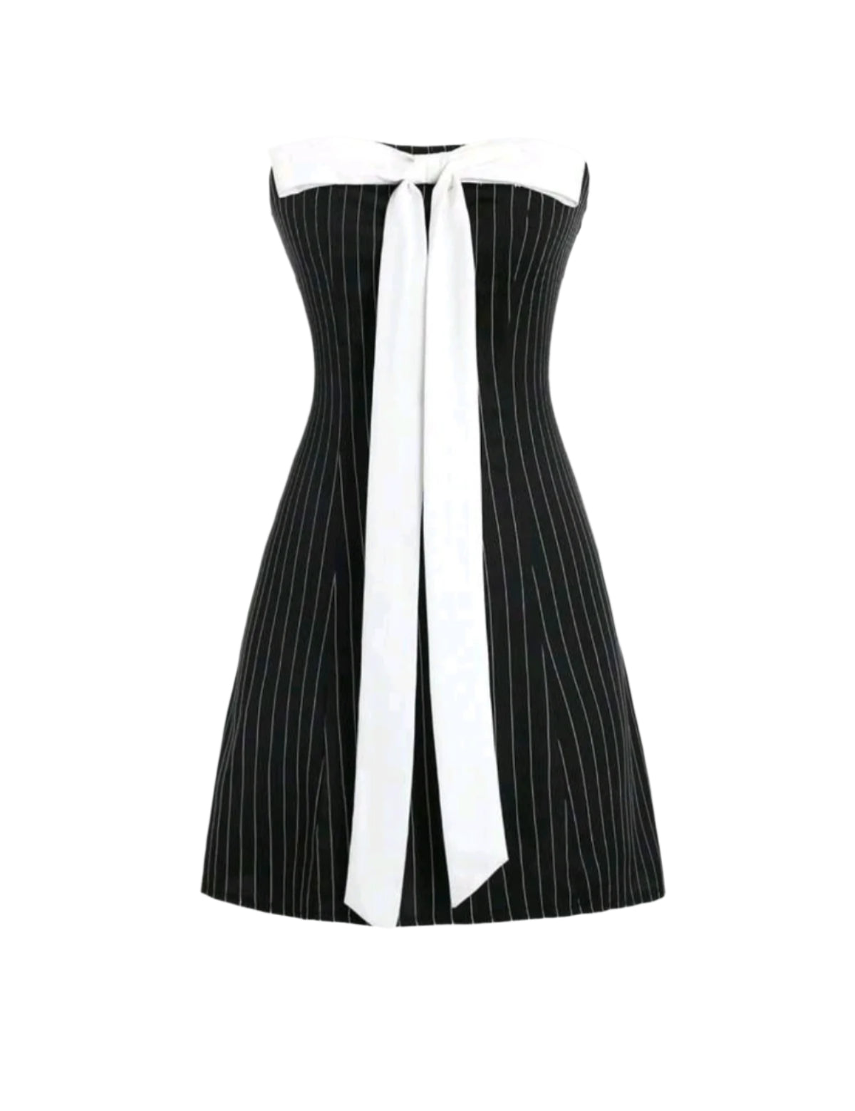 Címke nélküli, fekete-fehér, pánt nélküli miniruha, elegáns függőleges csíkozással és fehér masnis megkötővel a mellrészen. Testhez simuló szabása kiemeli az alakot, míg a különleges masni nőies és játékos megjelenést kölcsönöz. Ideális választás randira, buliba vagy elegánsabb alkalmakra.