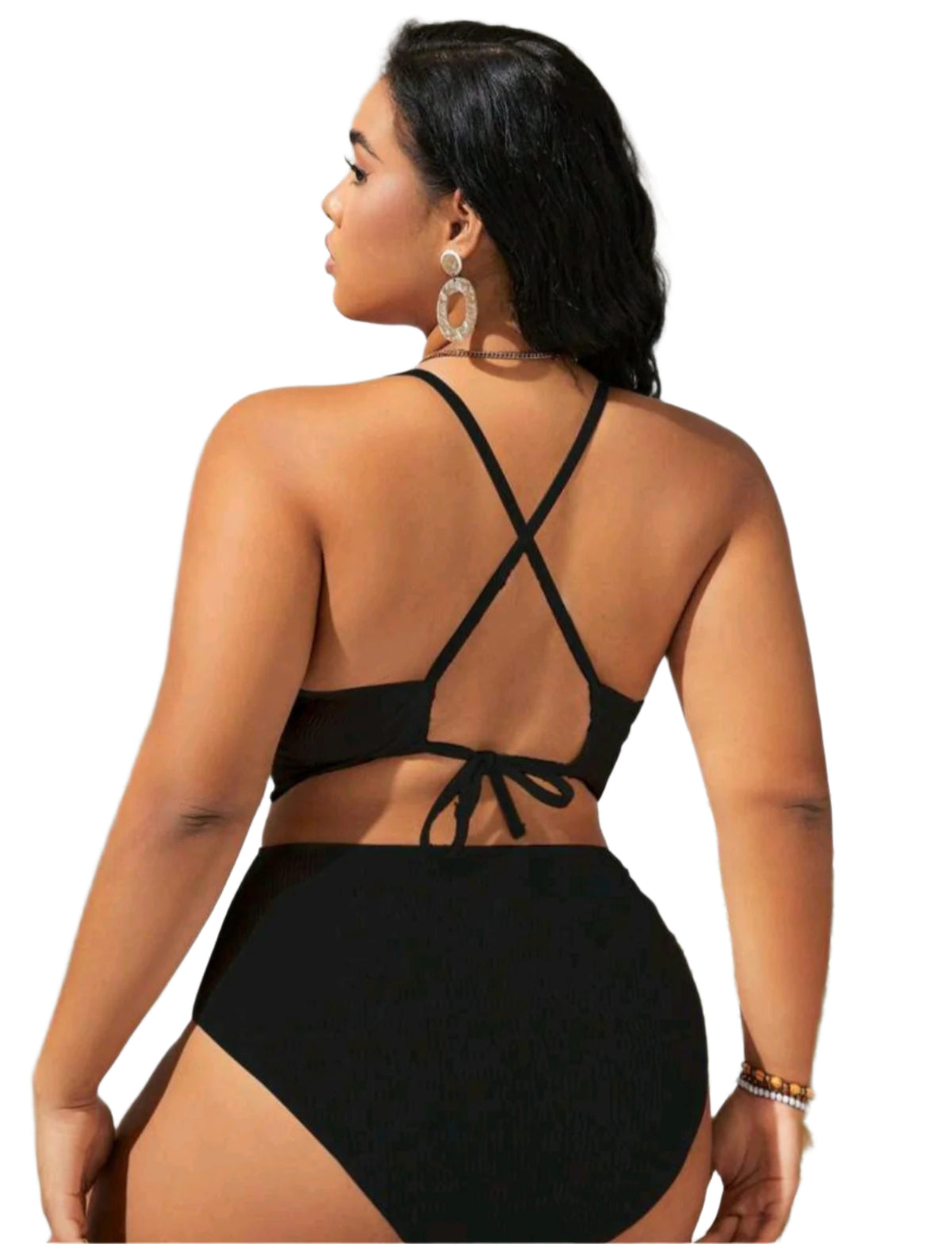 Címke nélküli, fekete, bordázott anyag, egyrészes fazon, mély V-nyakkivágás, nyakba akasztós pánt, karcsúsított derékrész, dekoratív pántos kivágás.