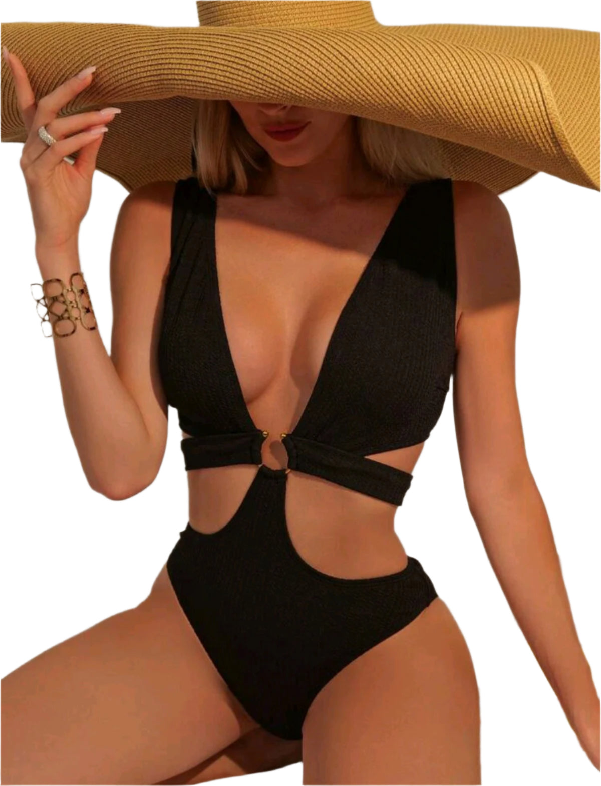 Címke nélküli, fekete egyrészes fürdőruha mély dekoltázzsal, dekoratív arany karikával a mellrészen, oldalt kivágott fazonnal és vastag vállpántokkal. Modern, elegáns megjelenést biztosít, miközben kiemeli a nőies vonalakat. Ideális választás stílusos nyári napokra a medence partján vagy tengerparti pihenéshez.