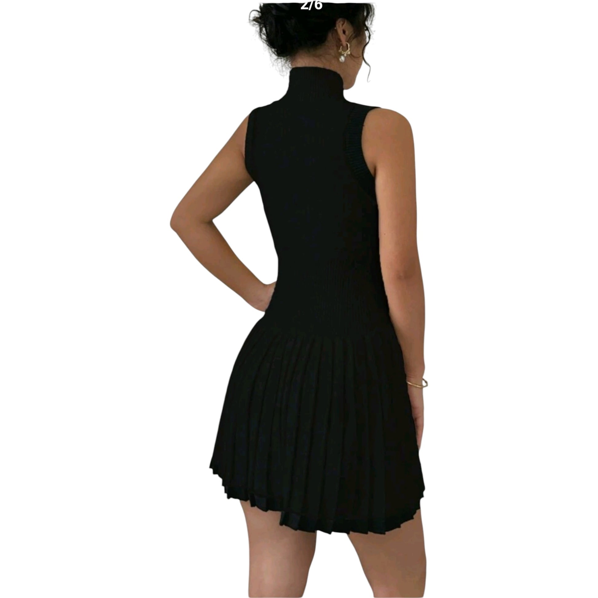 Címke nélküli, fekete, ujjatlan, garbó nyakú, bordázott felsőrésszel, pliszírozott szoknyarésszel, mini.