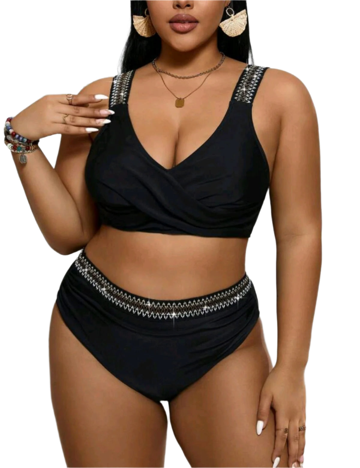 Címke nélküli, fekete, sima anyag, V-nyakkivágás, széles mintás pántokkal, magas derekú alsó díszített derékrésszel, kényelmes és alakformáló fazon, strandoláshoz és medencéhez is ideális.