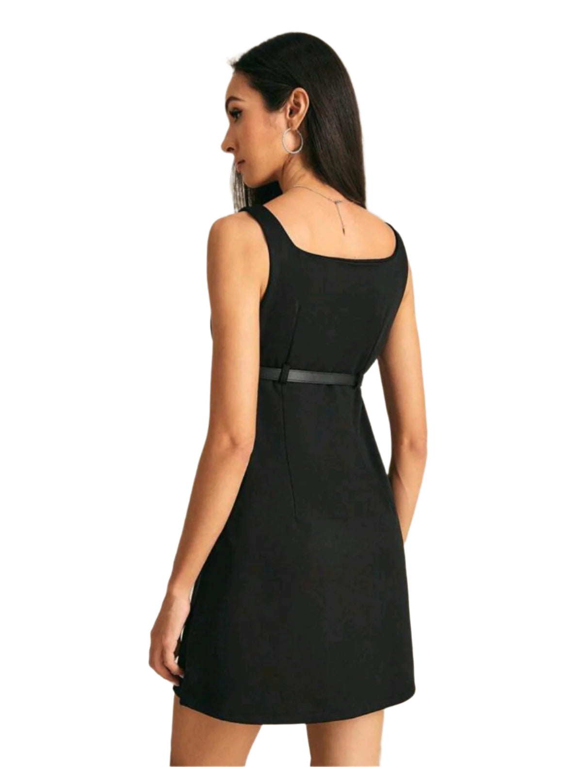 Címke nélküli, elegáns és letisztult fekete ruha enyhén A-vonalú szabással. Kerekített szögletes nyakkivágása nőies megjelenést biztosít, míg a mell alatt végigfutó vékony öv fém csattal hangsúlyozza a derekat. Tökéletes választás randira, vacsorára vagy akár irodai viseletként is.