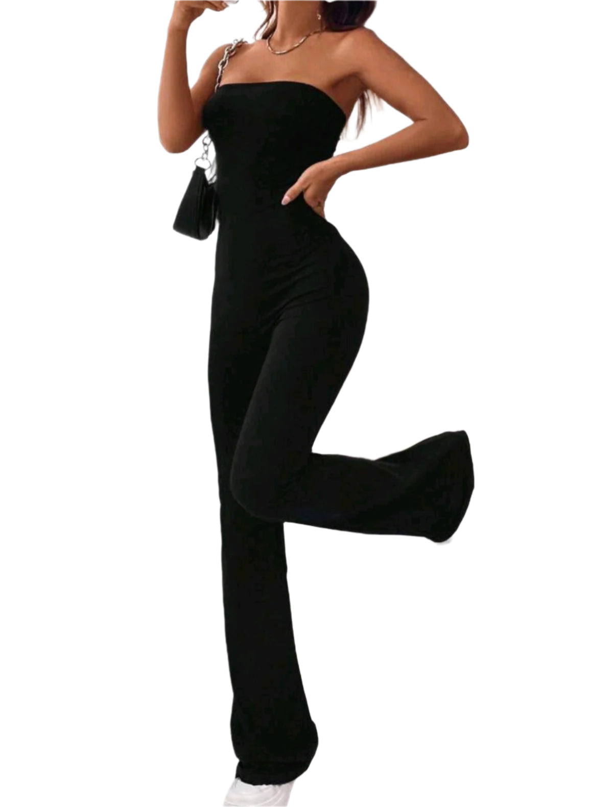 Címke nélküli, testhezálló, pánt nélküli fekete overall. Rugalmas anyagból készült, hosszú szárú fazon, enyhén bővülő nadrágszárral. Letisztult, modern megjelenés, amely tökéletes hétköznapi viseletként, de sportosan vagy elegánsan is kombinálható.